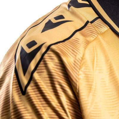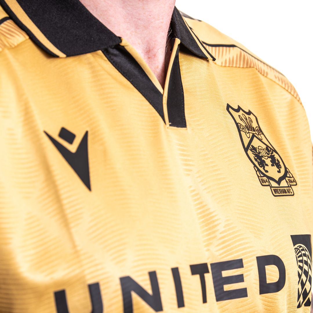 The sleeves have a subtle dragon-skin pattern - nodding to the club’s “Red Dragons” nickname - there is a tribute to the 266 killed in the 22nd September 1934 Gresford Collier disaster below the collar on the upper back, and the kit is completed with black shorts and gold shorts.