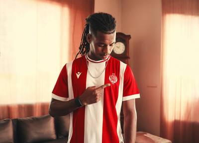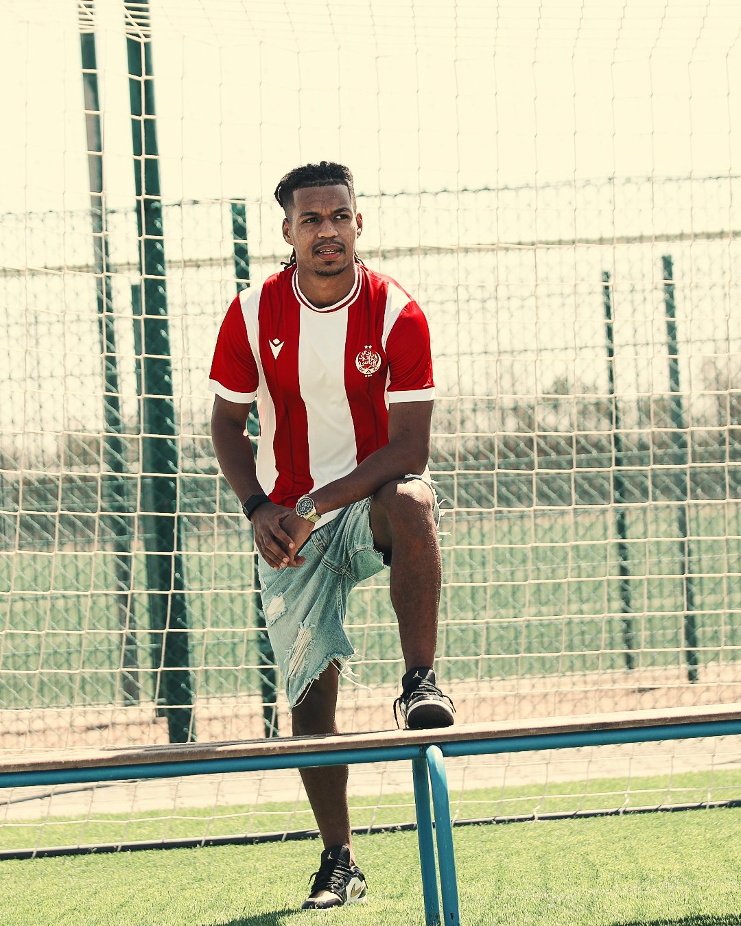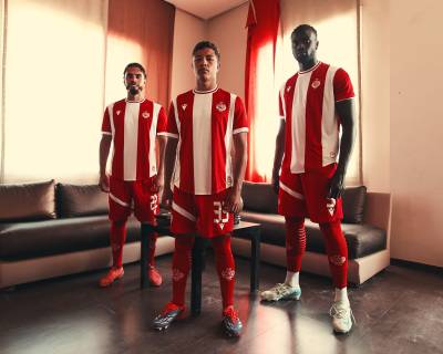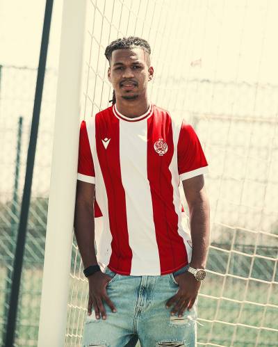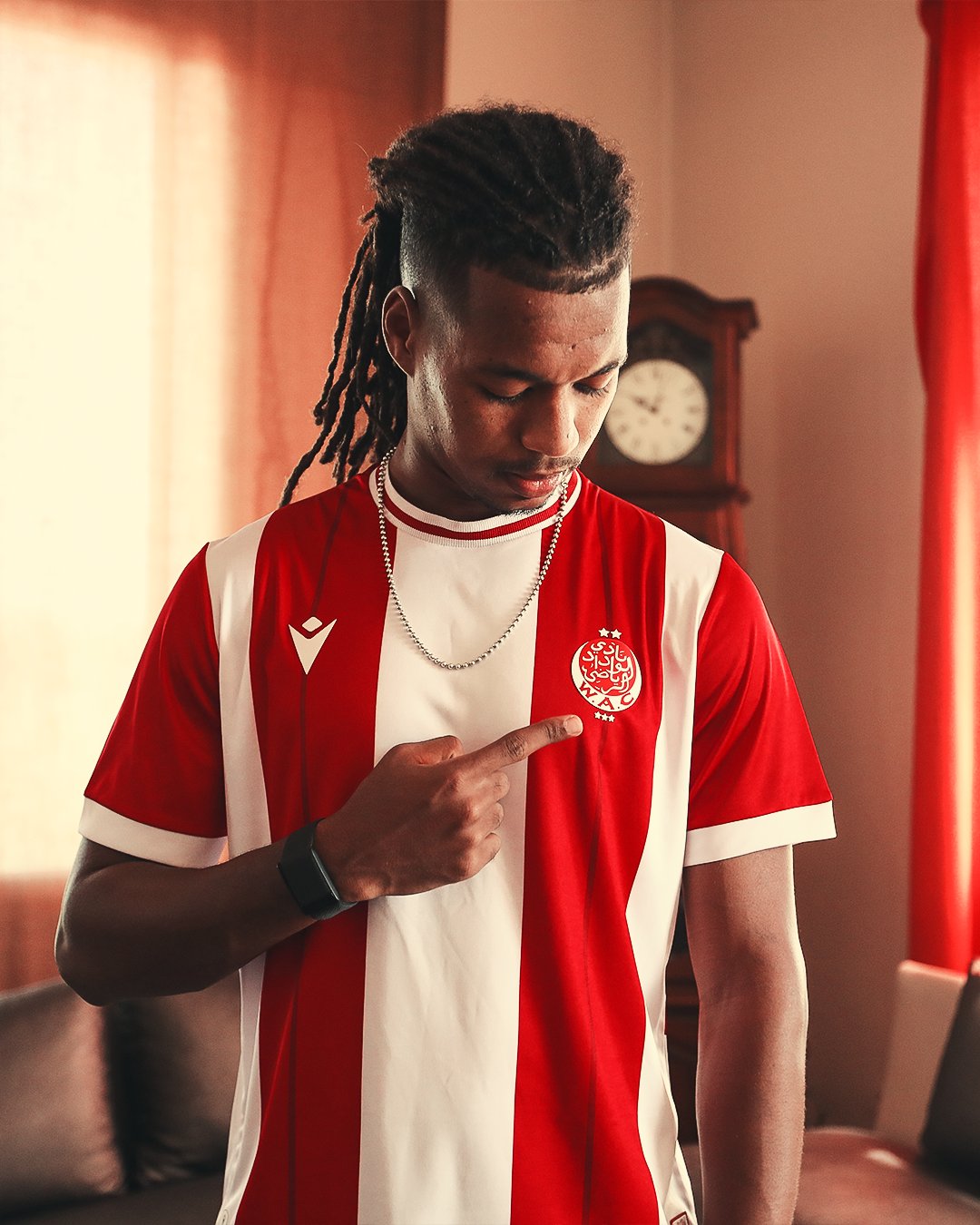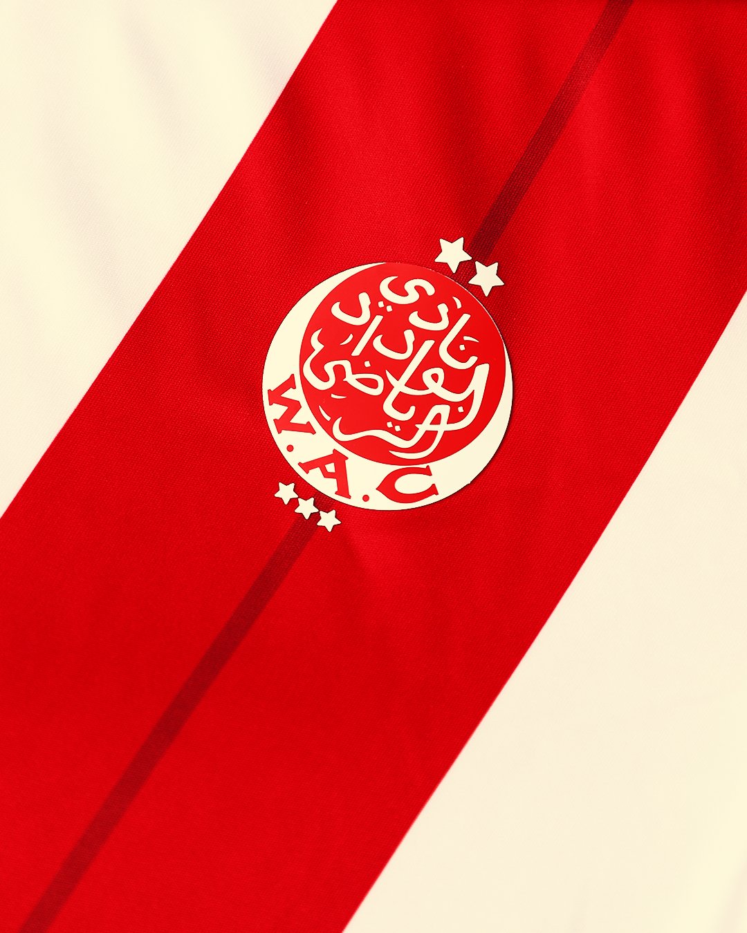 The 2024-25 red-and-white-striped primary release for the Casablanca-based Moroccan Botola Pro side boasts a thin tonal stripe running vertically behind the crest - and mirrored behind the Italian supplier’s “Hero” chest logo - and neat crew neck and cuffs, the latter contrasting with the red sleeves.