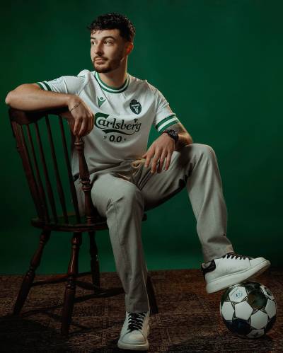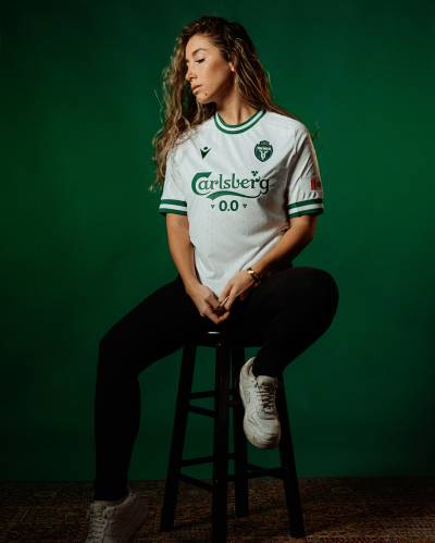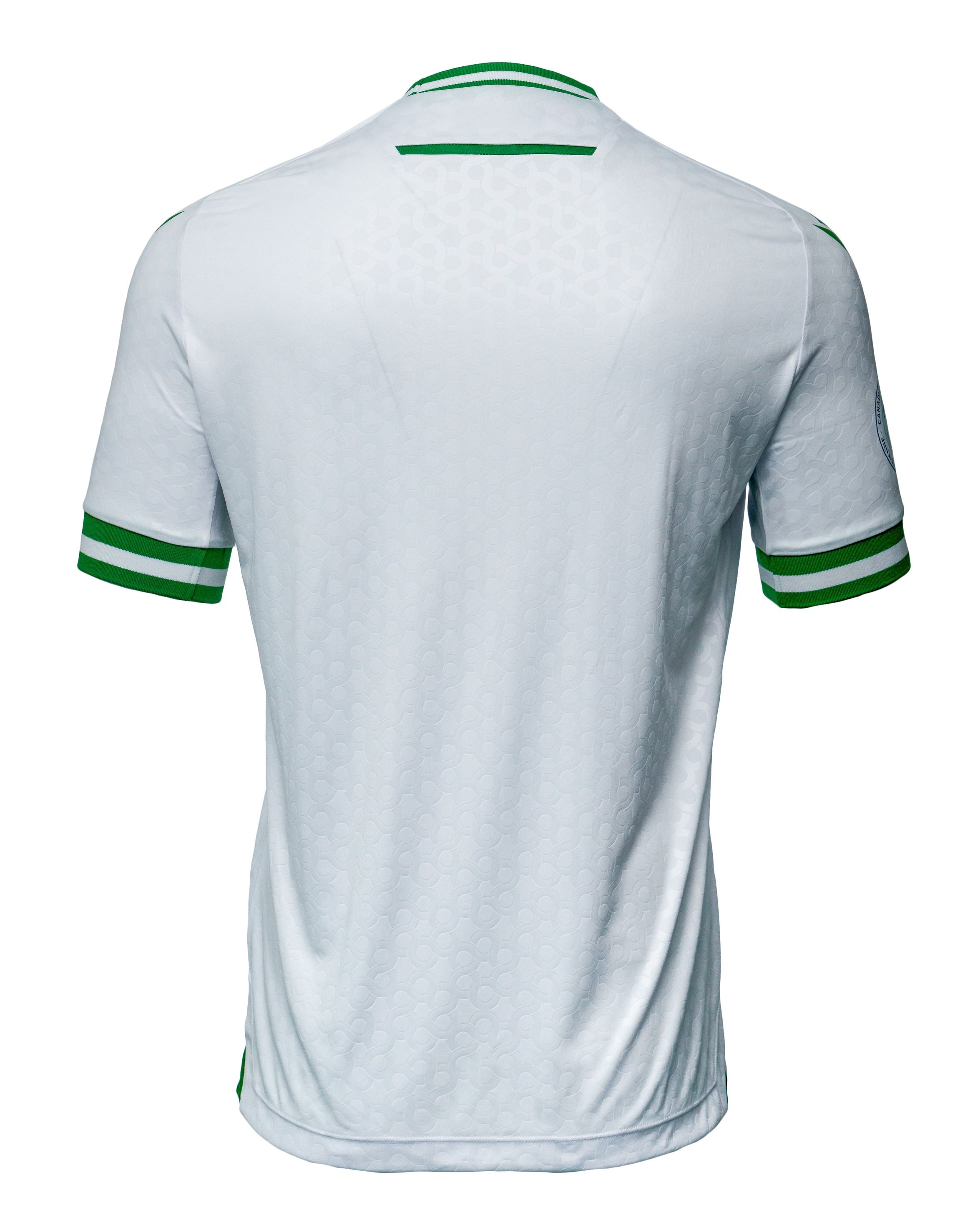 The jersey is primarily white, with a subtle textured design and green detailing on the collar and sleeves. The club crest and Macron logo are placed on the chest, while the kit is completed with matching shorts and socks.