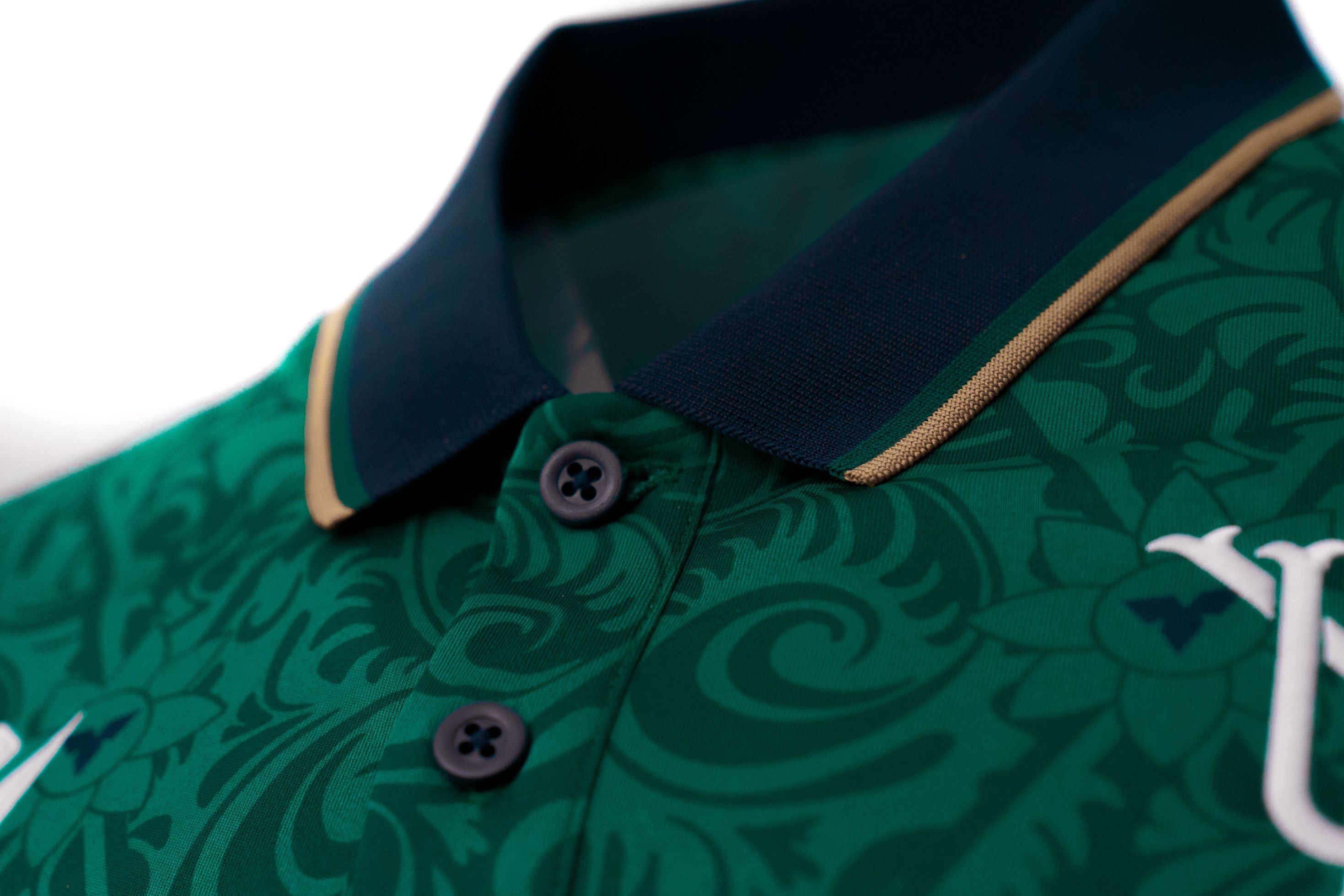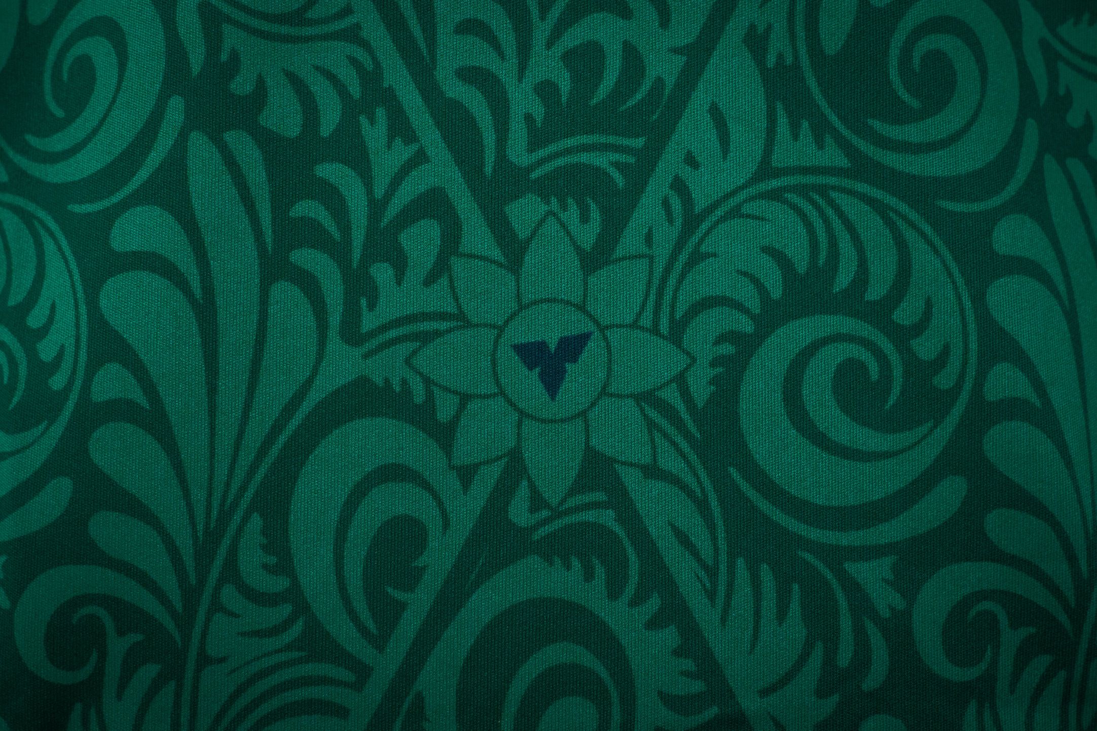 The design draws inspiration from the architecture and historical details of Toronto’s Old City Hall. It features a deep green base with a detailed pattern that reflects the floral stonework and decorative carvings found on the building’s exterior. It also has a dark navy collar and cuffs, along with gold trim.