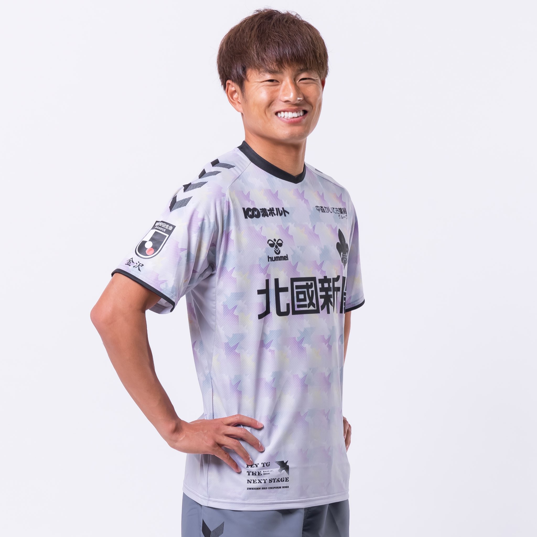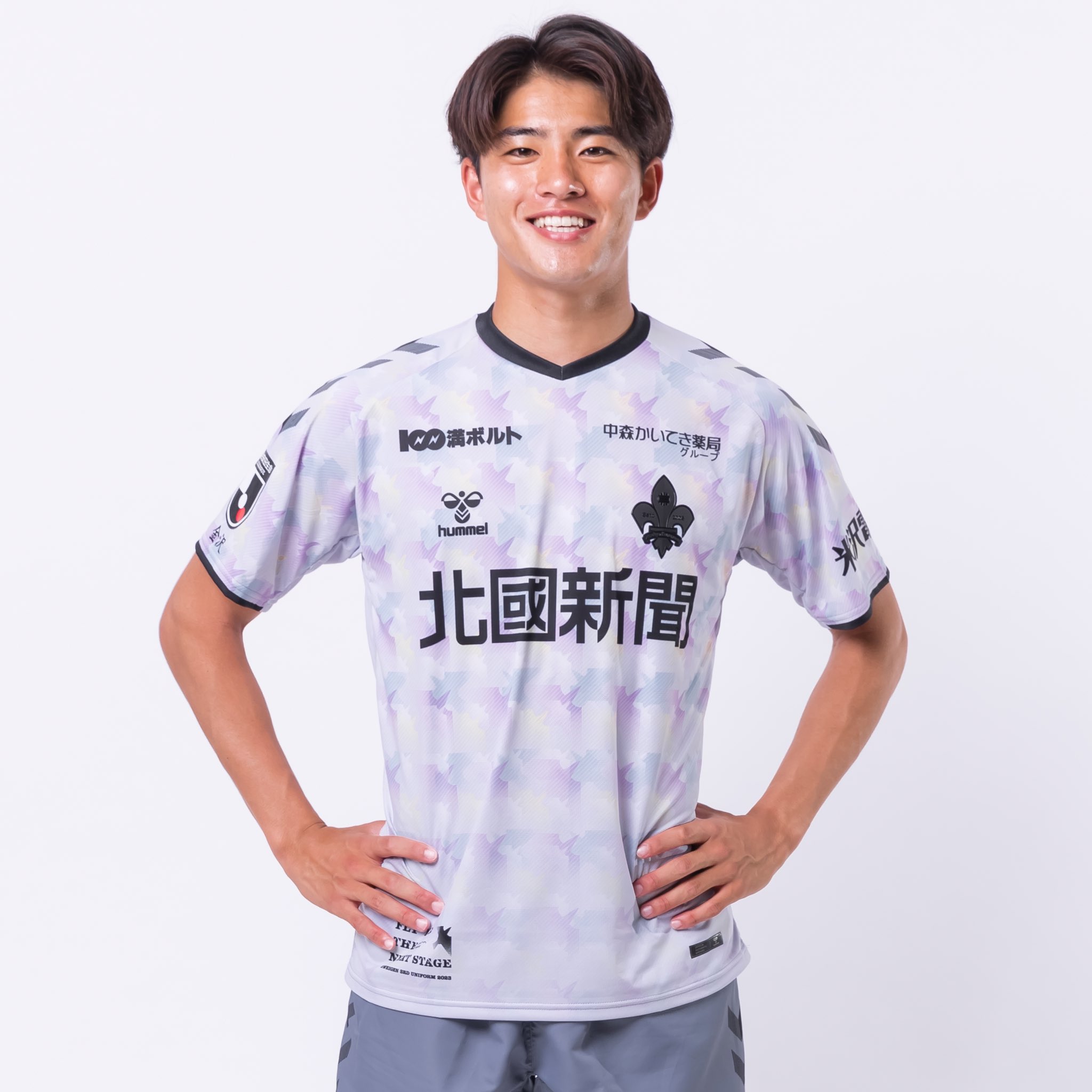 The 2023 secondary-change release for the Japanese J2 League side has been produced by Hummel and features pastel tones of blue and purple in a pattern that represents the club, fans and locals aspiring to reach the top - the J1 League - in the form of birds flying upwards.