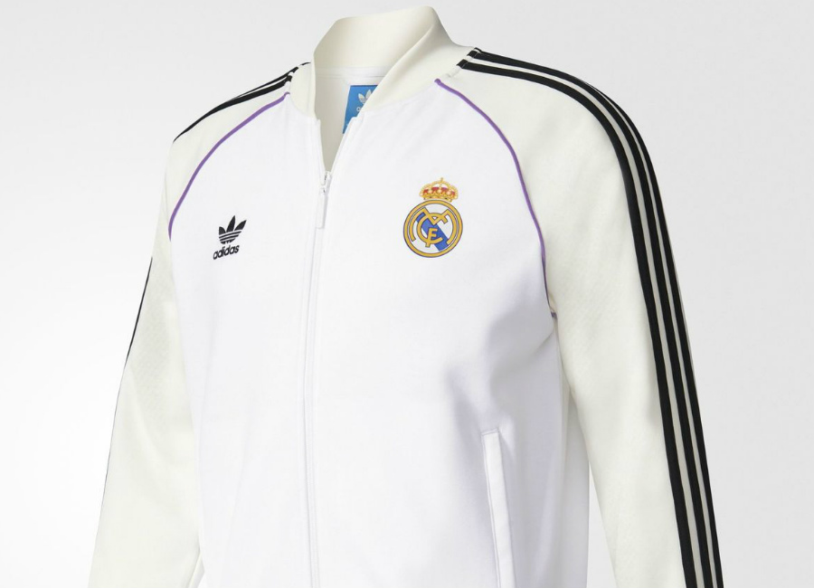 This Adidas Originals Real Madrid track jacket draws inspiration from the home jersey of Real Madrid, with a pristine white design and contrast piping.