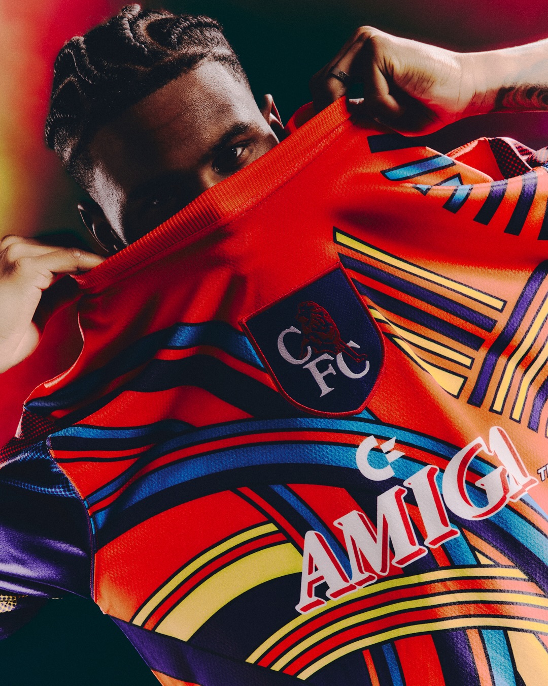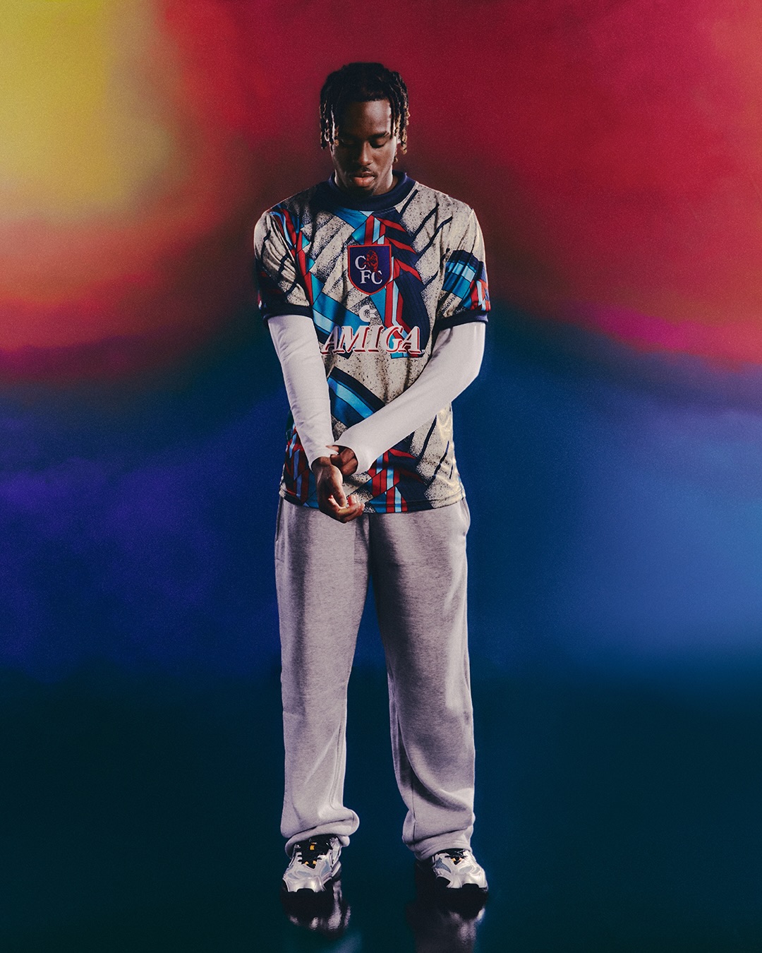 The goalkeeper jersey from the 1993/94 season, with its striking orange and multicoloured stripes, makes a return through a white t-shirt, navy track jacket, joggers, and a matching hoodie. This eye-catching design was a key part of Chelsea’s 1990s era, sure to catch the eye of any fan.
