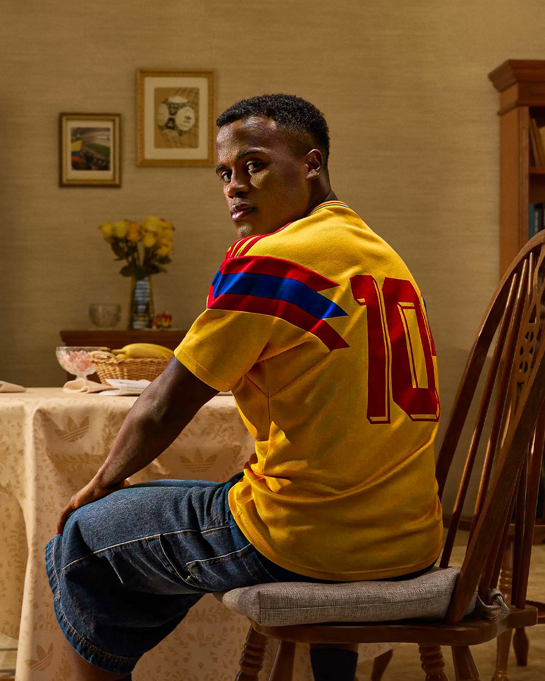On the chest, the Colombia national team crest is applied alongside the adidas Trefoil logo, both positioned to mirror the historic placement. The adidas three stripes run along the shoulders, while the reverse features the number 10 style associated with the period. A regular fit completes the overall construction, aligning with adidas Originals reissue standards.