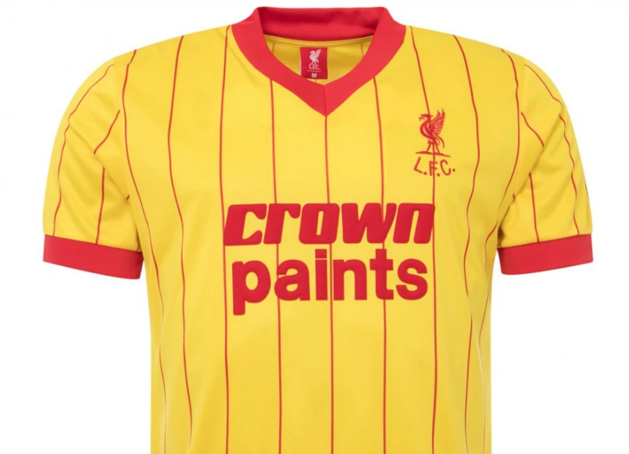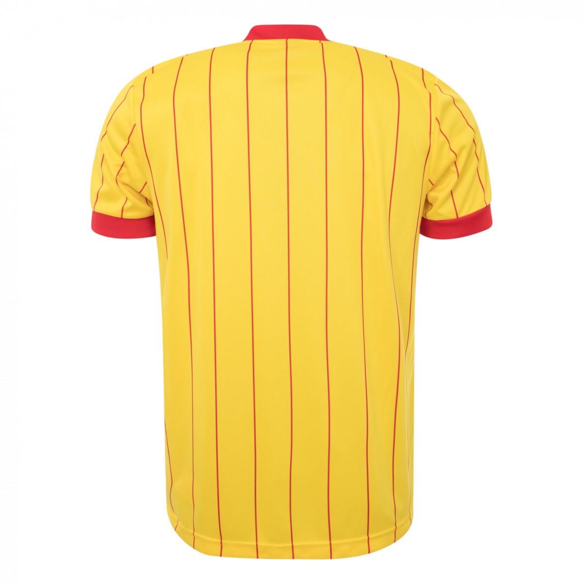 This Liverpool 1982 LFC Away retro shirt is in a bright yellow with a thick red ribbed v neck and matching cuffs. Throughout the shirt are vertical red pinstripes with red LFC Liverbird embroidery to the left of the chest and large red felt crown paints to the centre.