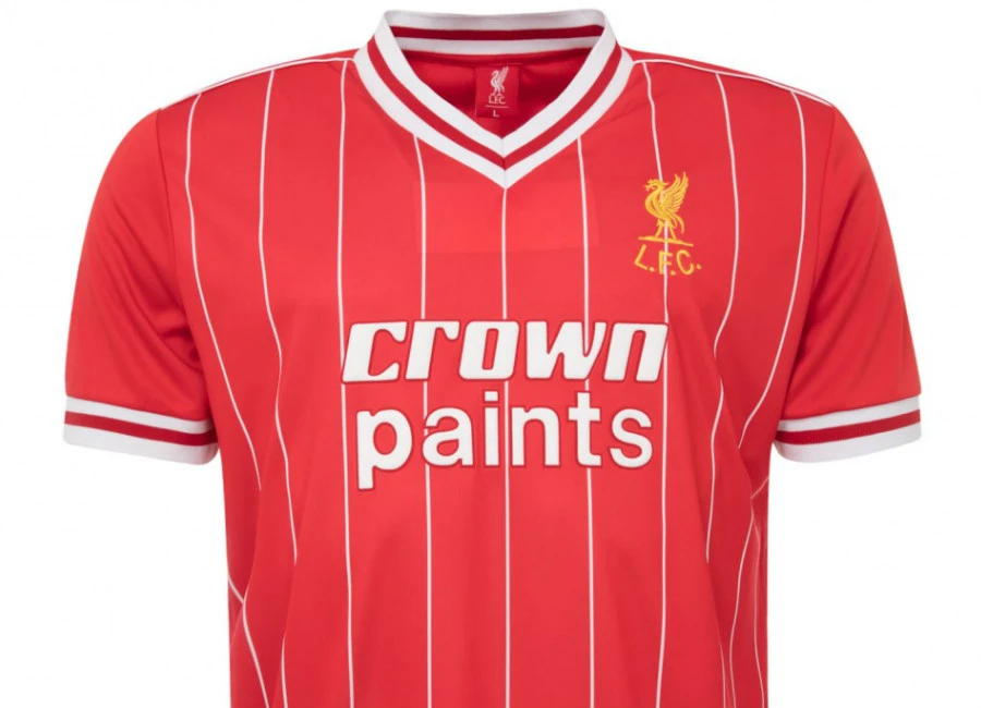 This Liverpool 1982 LFC Home retro shirt is red with a thick white and red ribbed v neck with matching cuffs. Throughout the shirt are vertical white pinstripes with yellow LFC Liverbird embroidery to the left of the chest and large white felt crown paints to the centre.