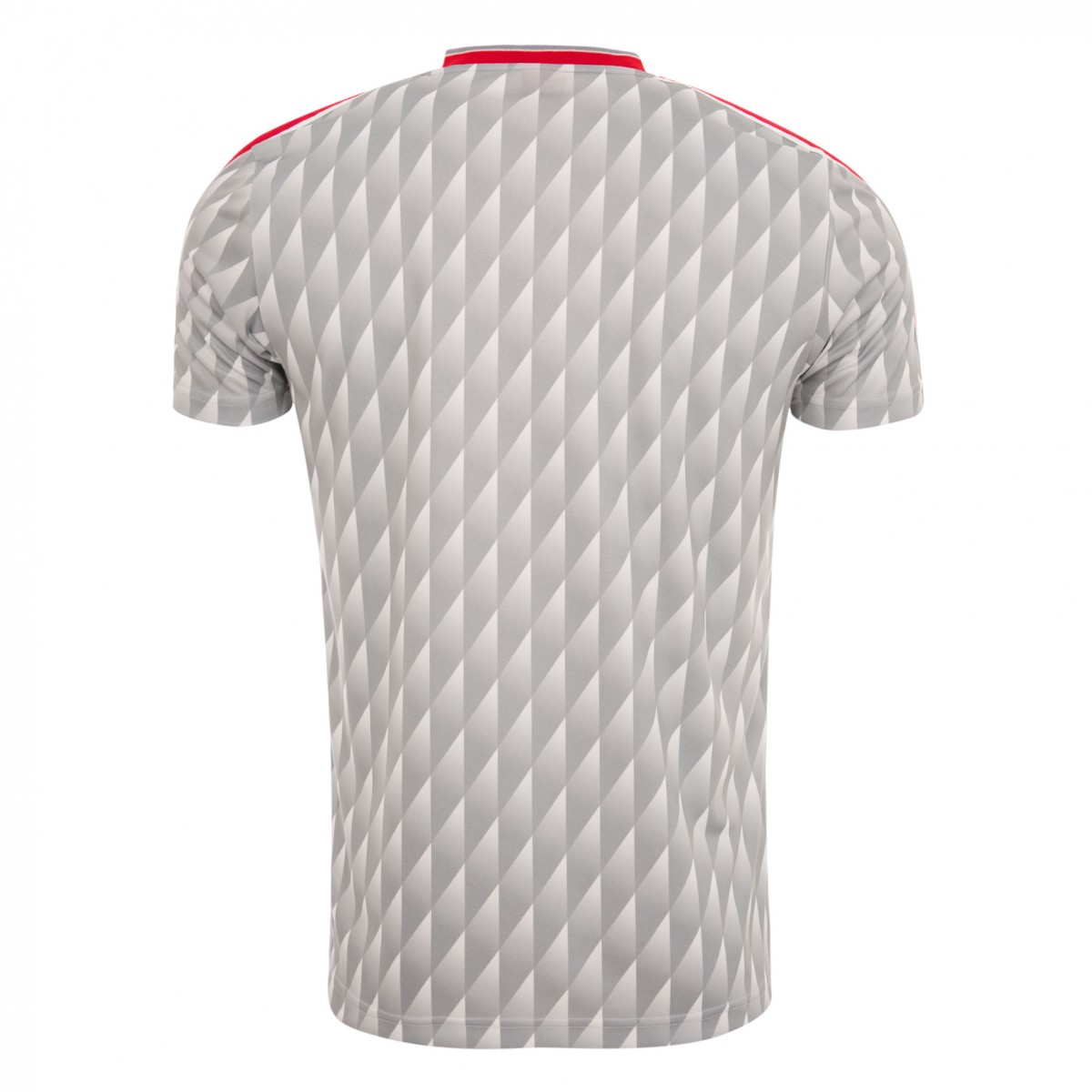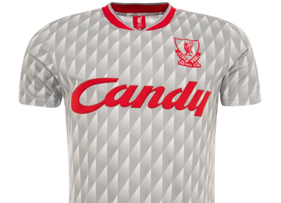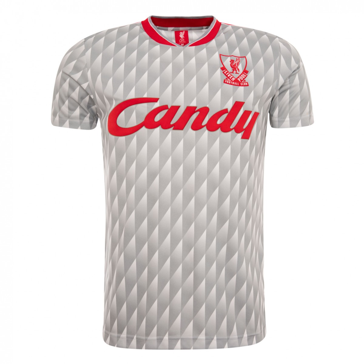 This Liverpool 1989-91 LFC away retro shirt is featured in grey with a white diamond pattern throughout. Featuring a v neck with white and red tipping continuing across the shoulders. To the left of the chest is a red and white raised retro crest badge with red raised Candy to the centre of the chest.