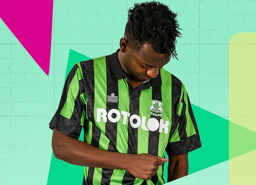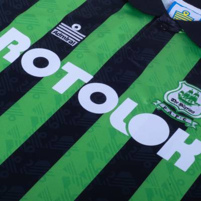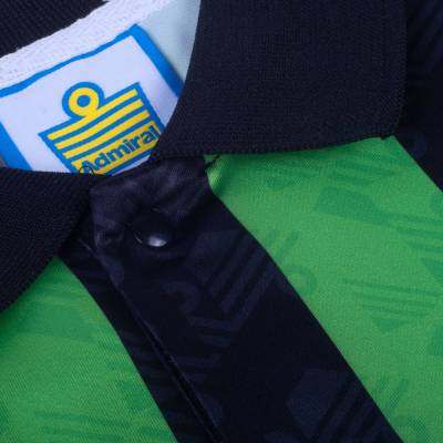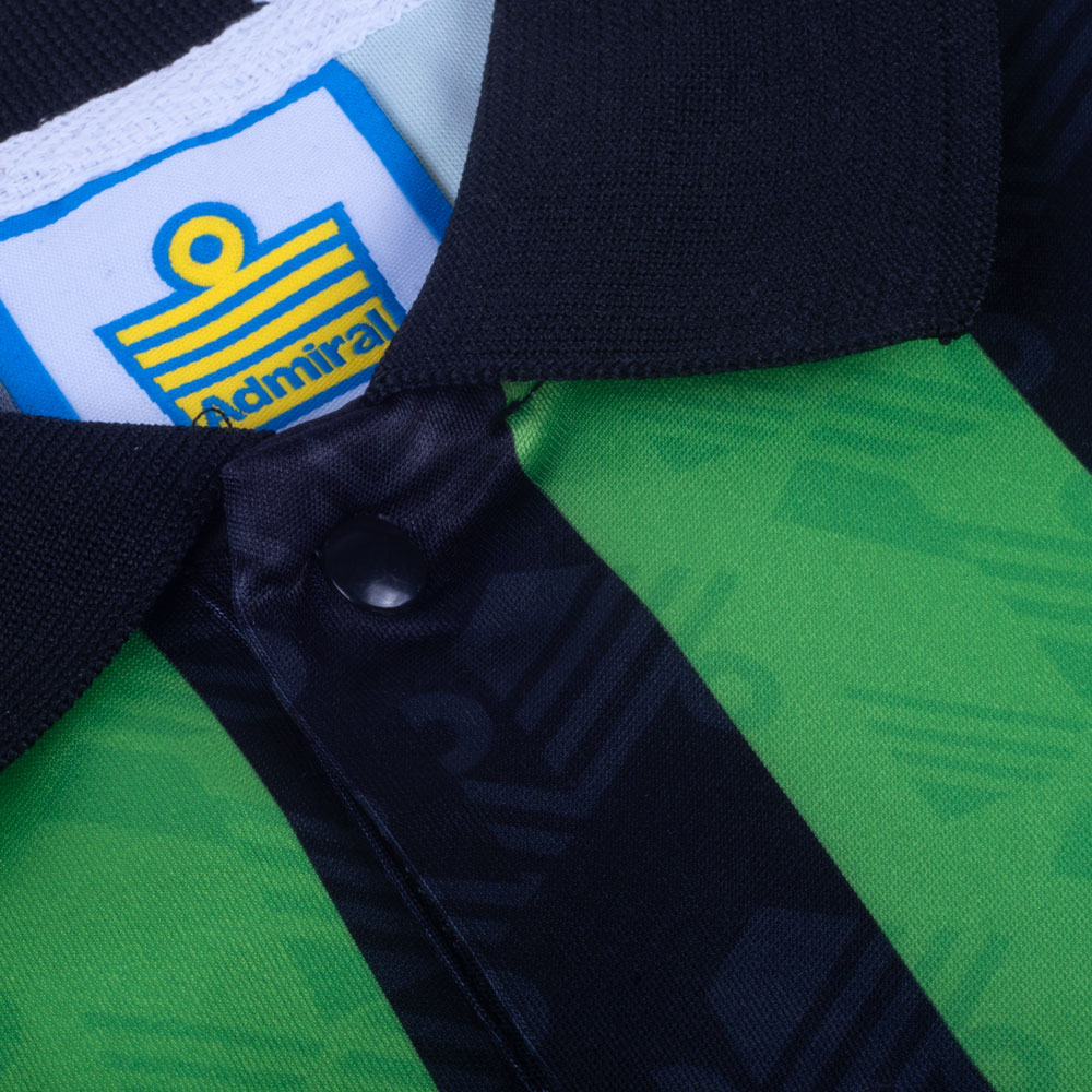 Featuring the branding of contemporaneous supplier Admiral - both in the embroidered chest logo and the sublimated patterning - the green-and-black-striped collared release is accurate to the stylings of three decades ago.