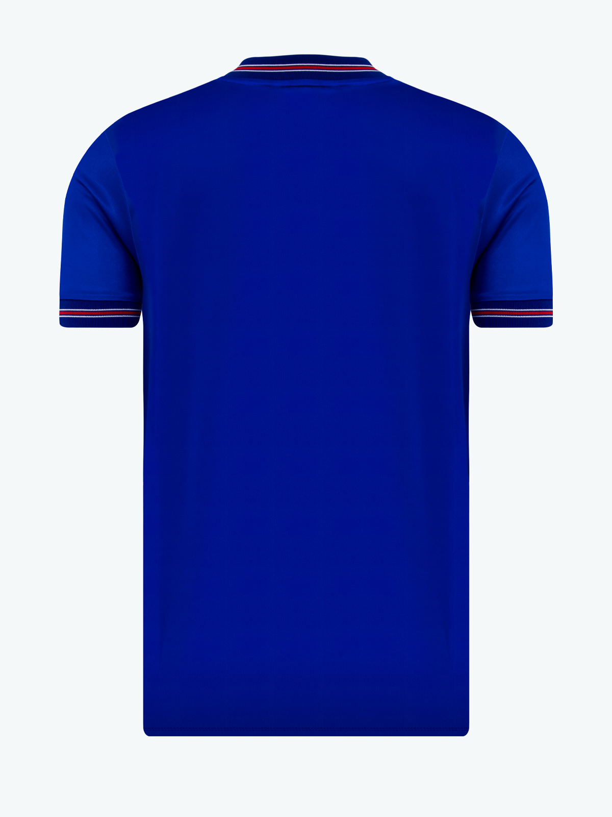 The recreated Umbro jersey features a deep royal blue base with tonal vertical stripes formed through a woven jacquard pattern incorporating repeating “P.F.C.” and Umbro logos. It includes a ribbed V-neck collar and sleeve cuffs trimmed in white and red, staying true to the original detailing. The left chest carries the white embroidered anchor crest, while the Umbro logo appears opposite.
