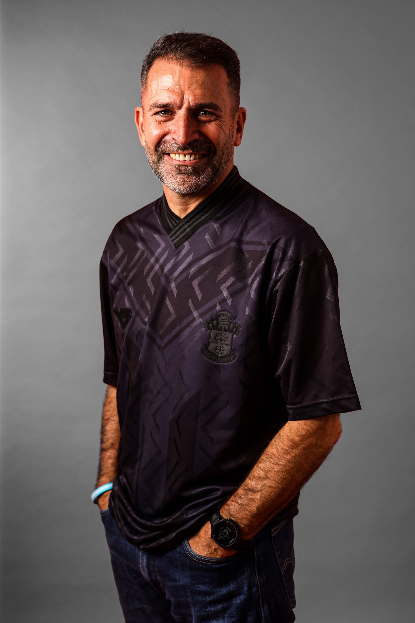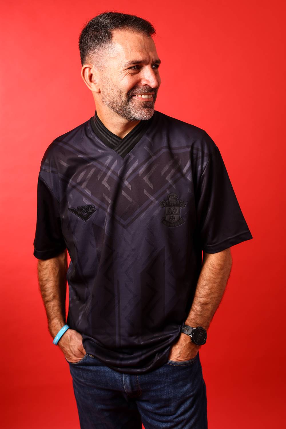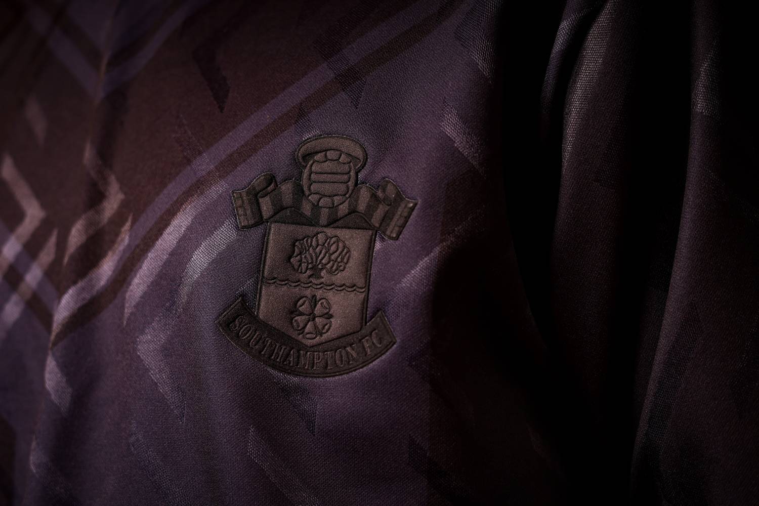 The new Southampton jersey is presented in an all-black colourway, incorporating tonal graphic detailing across the front that reflects the geometric patterning of the original design. The fabric features a subtle jacquard-style finish, with the pattern sublimated into the material.