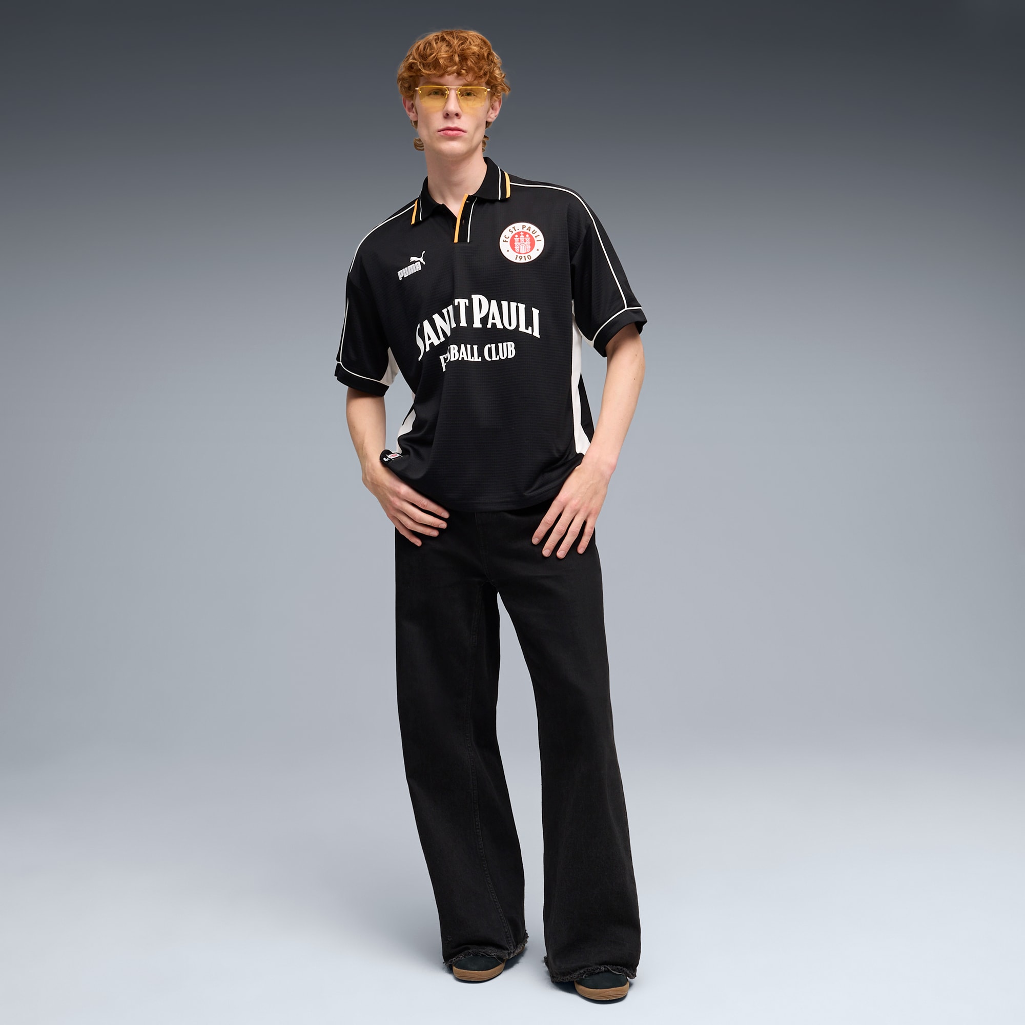 The St Pauli football shirt comes in black with white detailing and retains the visual structure associated with Puma’s late 90s design language. It features a polo style collar with a two button fastening and contrasting trim in white and yellow.