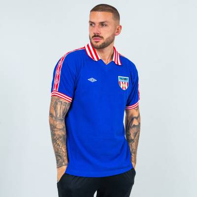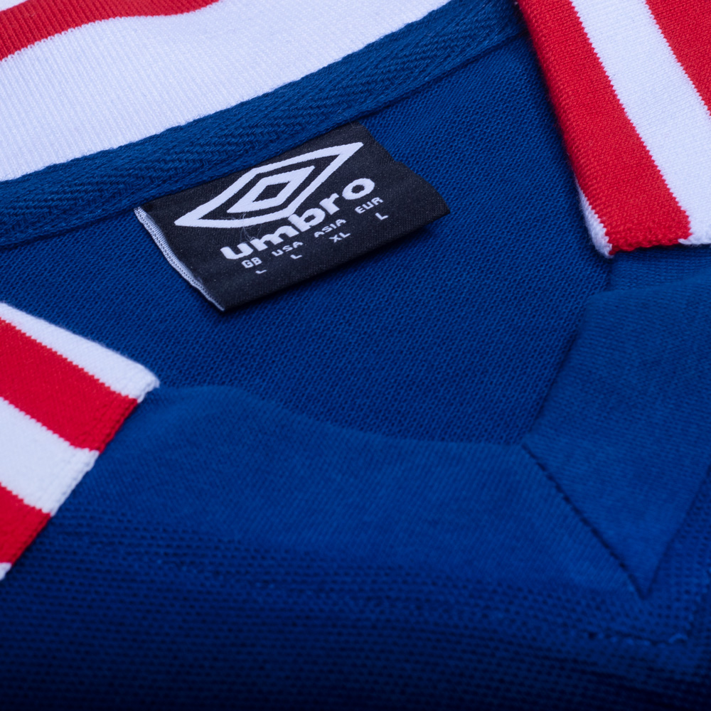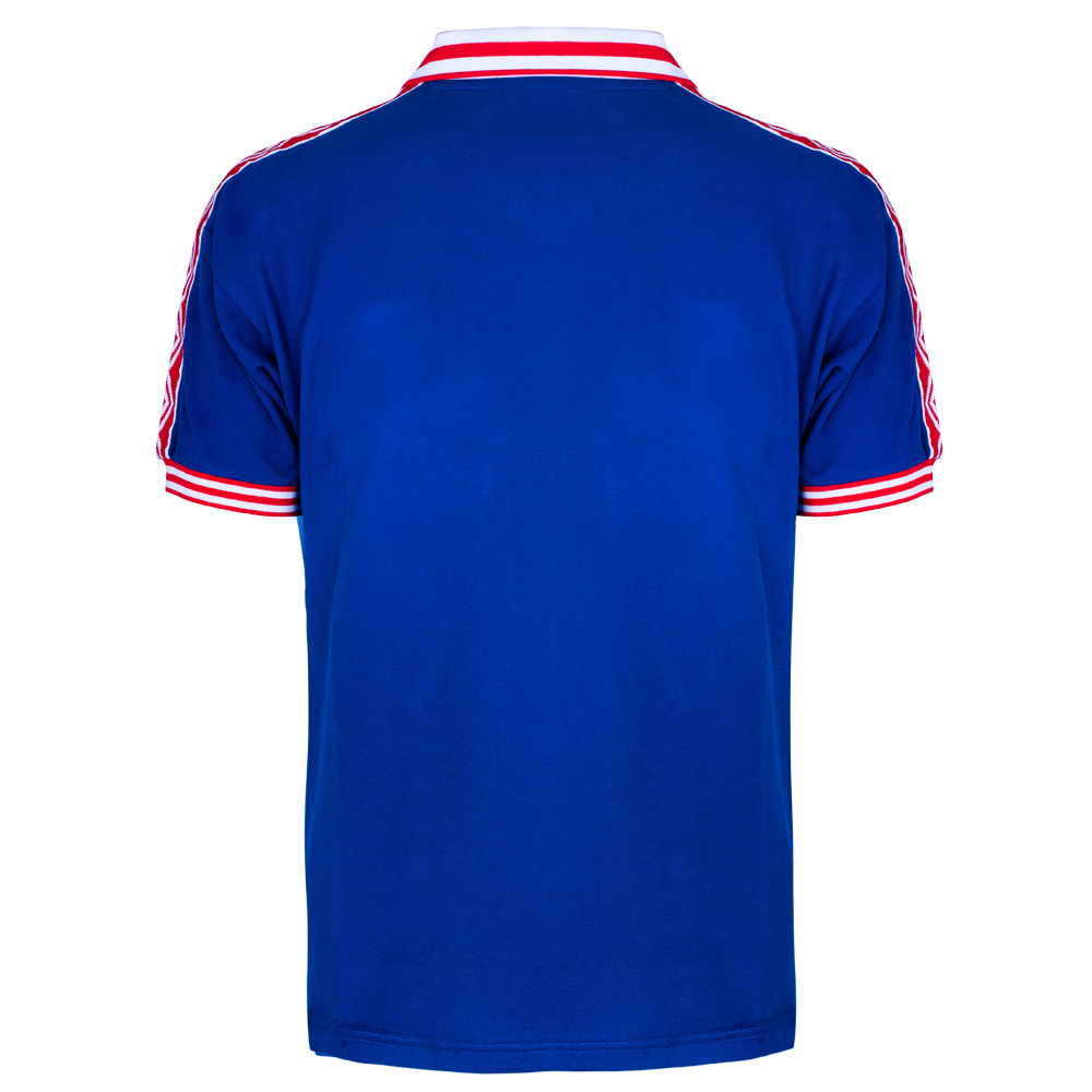 The late 1970s stylings include a winged collar - with red and white stripes, naturally, and matching the cuffs - and the shirt’s main colour of blue provides an attractive base for the lovely embroidery of the crest and maker’s logo.