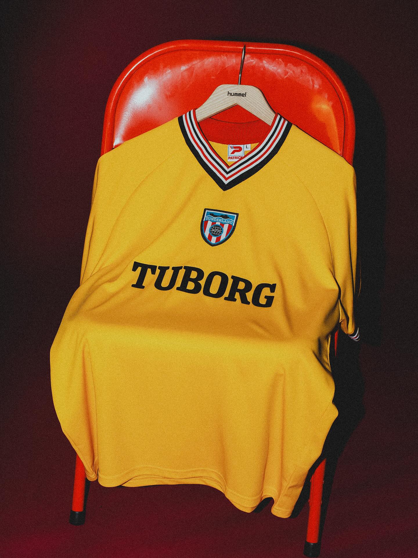 The shirt is predominantly yellow with a central Sunderland crest stitched onto the chest and Tuborg branding across the front in bold black.