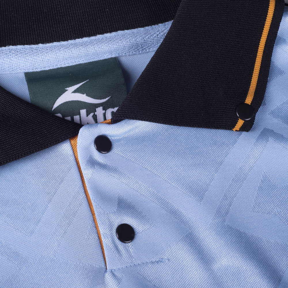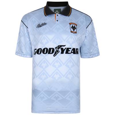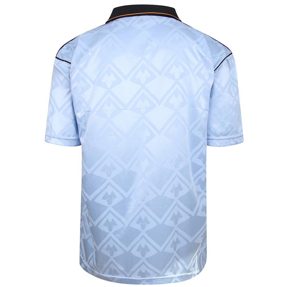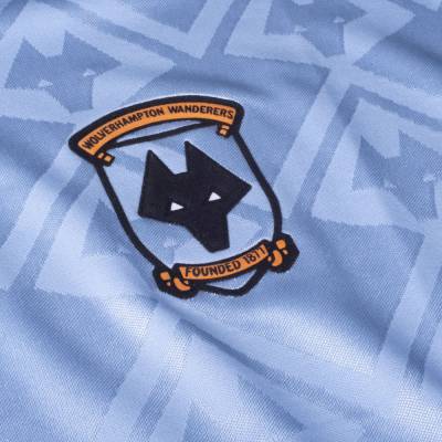In pale blue with a jacquard pattern and embellishment in, primarily, black and, crucially, old gold, this Wolverhampton Wanderers retro shirt takes us back three decades.