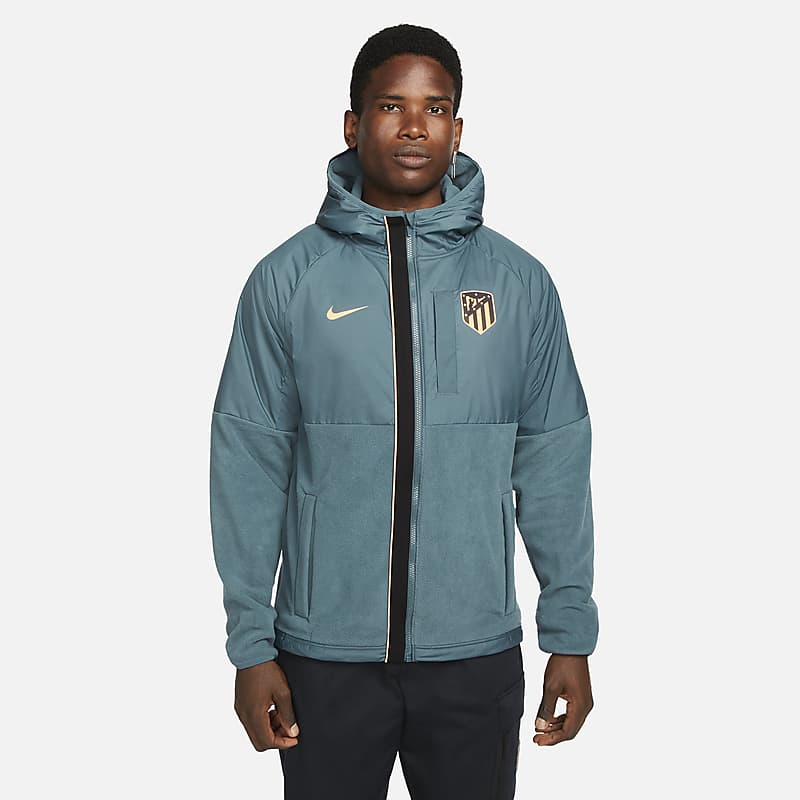 Stand proudly with your team as an all-weather fan in the Atlético Madrid AWF Winterized Full-Zip Football Jacket in Ash Green/Black/Peach Cream Soft fleece and a water-repellent finish help keep you dry and warm when you're cheering on your squad in...