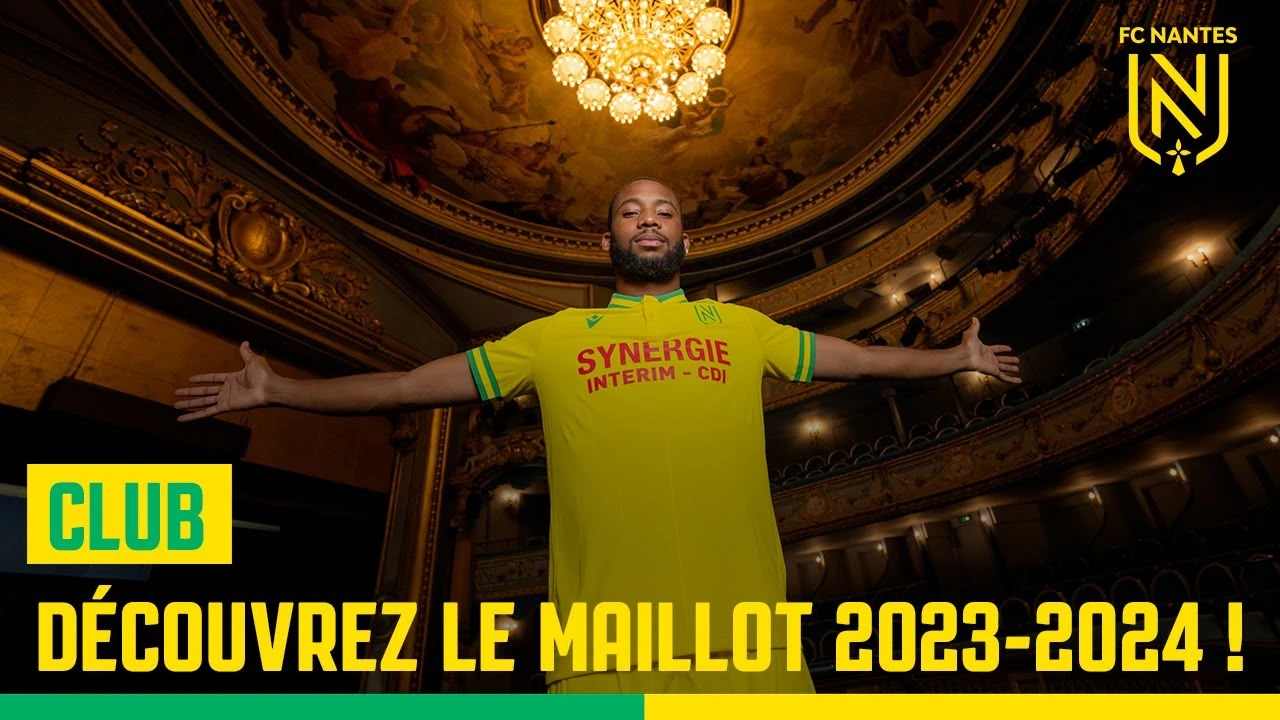 with the club's colours, logo, and the motto "On est Nantes," alongside the Macron logo and the words "Designed in Bologna," certifying that the garment is conceived, designed, and produced at Macron's Bologna HQ. The Macron Hero and the FC Nantes badge...