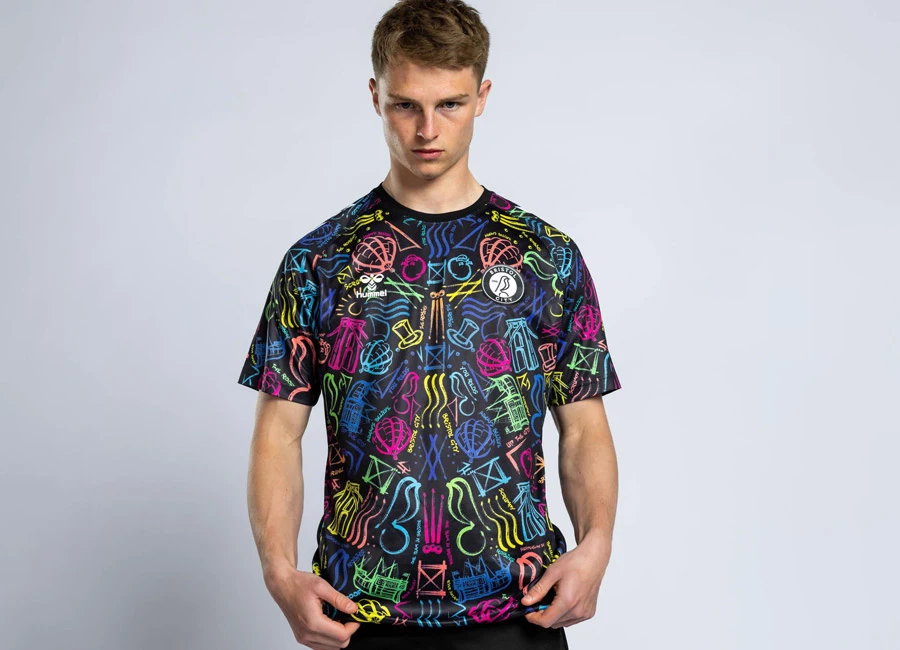 This is the Bristol City 22/23 Away Warm Up tee by hummel. There is a iconic Bristol themed bespoke design sublimated onto the shirt, continuing the graphic-based theme of iconic locations and connections to the city. The lightweight shirt is completed...