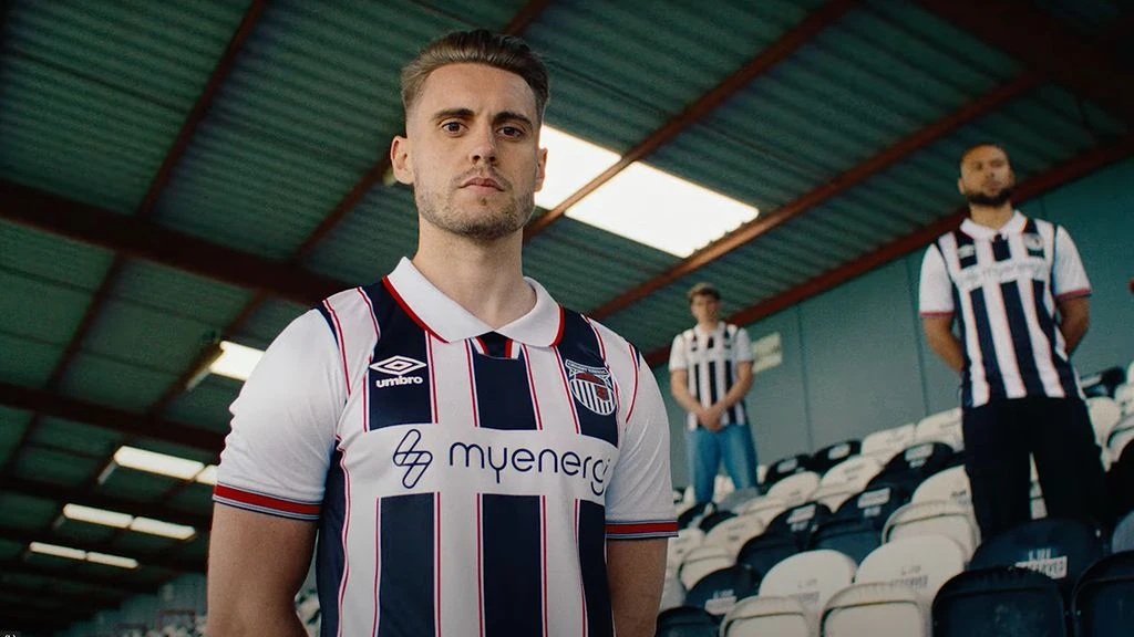 Grimsby Town have unveiled their 2025/26 home kit, produced by Umbro and inspired by the club’s 1998/99 home shirt. The shirt features classic black and white vertical stripes with a bold red chest band showcasing the myenergi sponsor, accented by red...