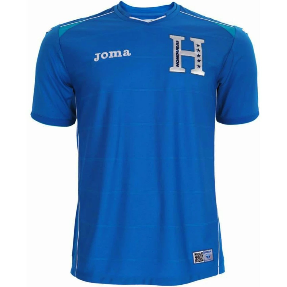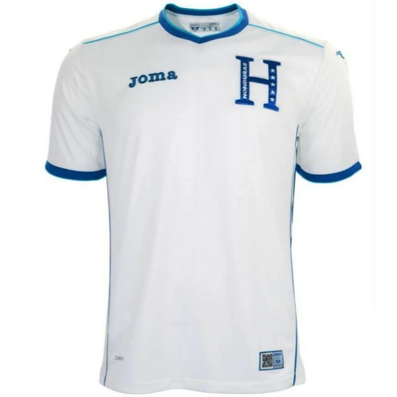 This is the new Honduras Home football shirt, by Joma, to be worn in the 2014 World Cup finals in Brazil. The white shirt is complemented with blue and turquoise trim, with the focal point being the newly redesigned 'H' crest, with the word 'Honduras'...