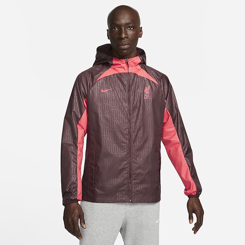 The Liverpool F.C. AWF Jacket in Burgundy Crush/Siren Red/Siren Red is a lightweight layer for days when you want to play through the rain, but don't want to be soaked with sweat. Team crest and colours let everyone know who you support. This Nike...