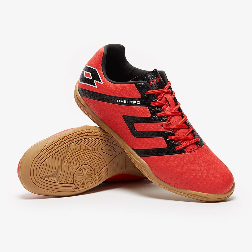 Control the game wearing Lotto Maestro 700 IV ID indoor football shoes in Flame Red/All Black, featuring a new outsole for superior traction on hard surfaces. Designed for creative players, the Lotto Maestro 700 IV ID continues the Maestro range’s...