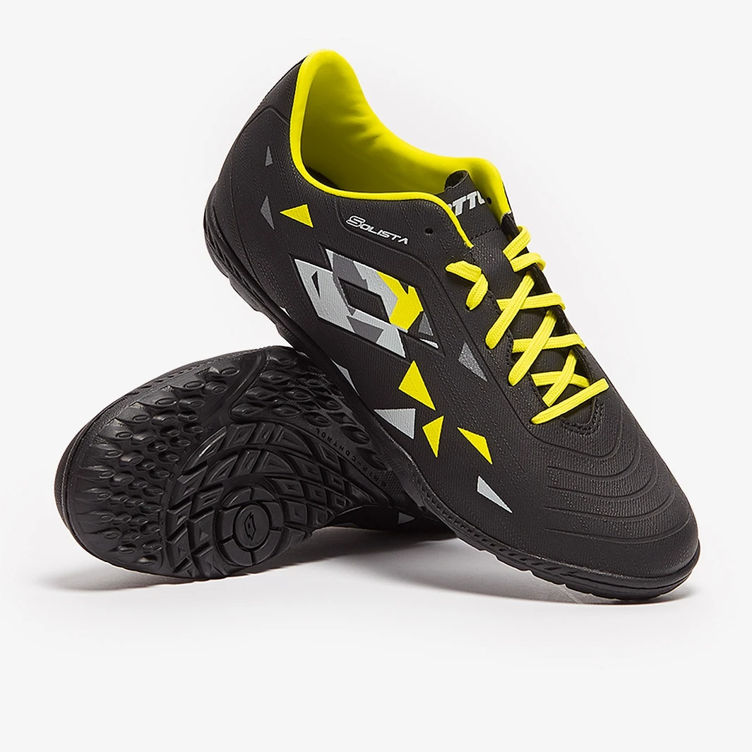 Lead the next generation of speed wearing Lotto Solista 700 V TF turf football shoes in All Black/Vapor Gray/Safety Yellow, designed to make the fastest players even faster. Setting you up to combine raw pace with stunning agility, the Lotto Solista...