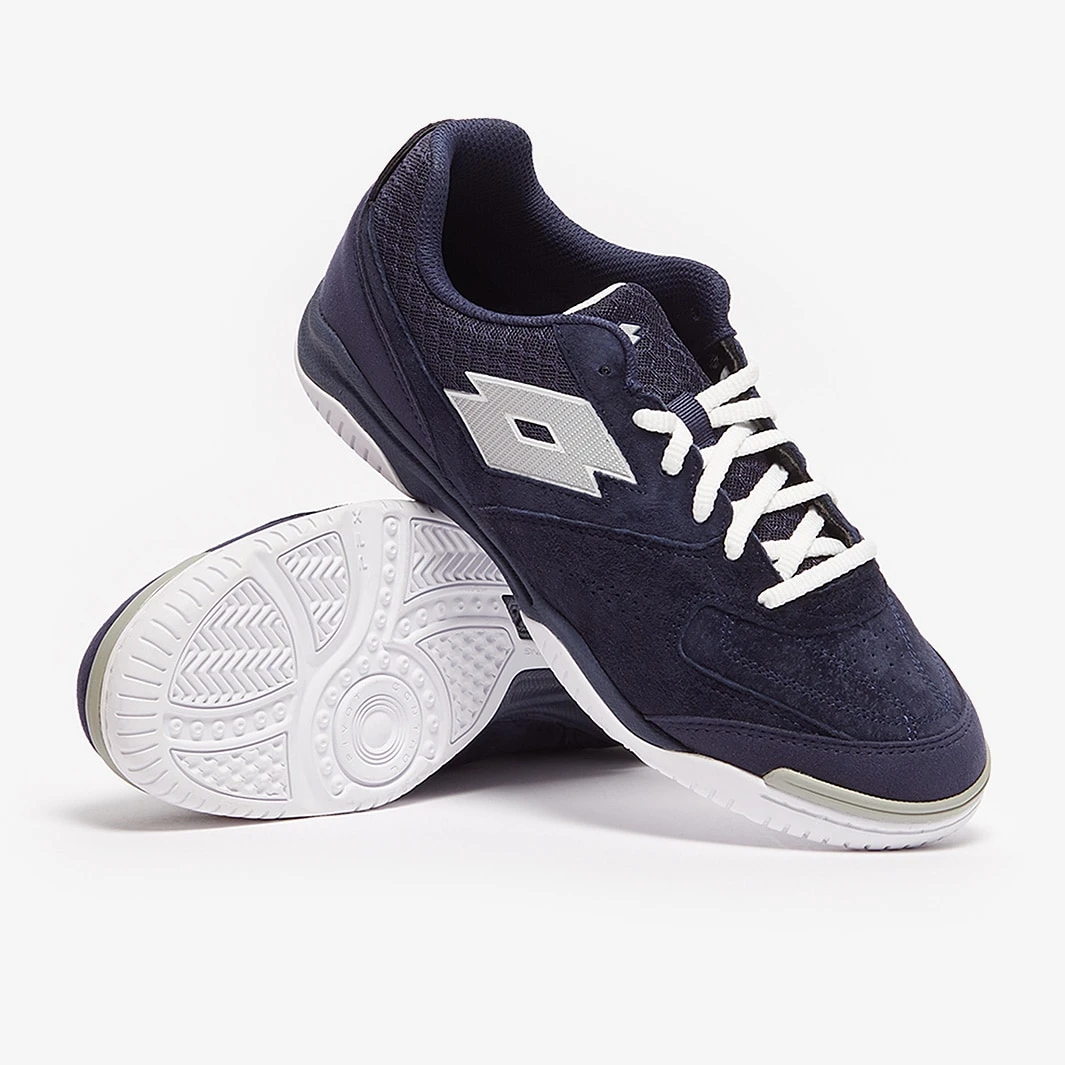 Master the small-sided game wearing Lotto Tacto 201 V IN futsal shoes in Navy Blue/Silver Metal 2/All White, featuring a pig skin nubuck upper for superior touch and comfort. One of the most popular professional-standard futsal shoes, the Tacto returns...
