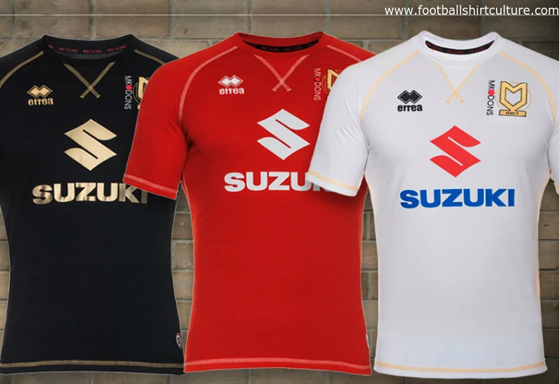 is red with black and gold accents, paying homage to the kit worn in the first season after Wimbledon FC was rebranded as MK Dons in 2004-05. The full-colour crest features a touch of white, matching the branding of main sponsor Suzuki. The...