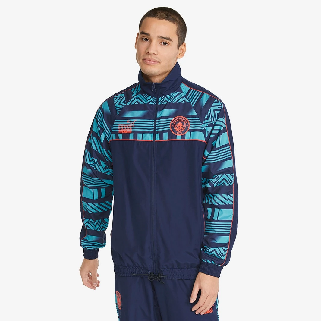 Support City on the streets or the training pitch with the PUMA 21/22 Manchester City FtblHeritage Track Jacket in Peacoat navy/Scuba Blue. This jacket pays tribute to City in old-school style, with the famous badge on the left chest and the PUMA King...