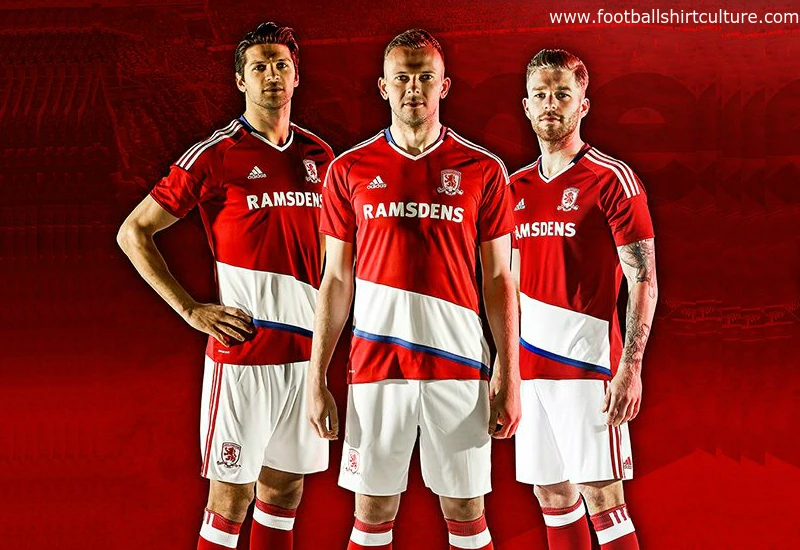 This is the new Middlesbrough FC 16/17 Home football kit by Adidas. The 2016/17 Boro home shirt is in power red with a white panel trimmed in bold blue on the lower part of the shirt. A bold blue trim on the layered v collar completes the colourway....