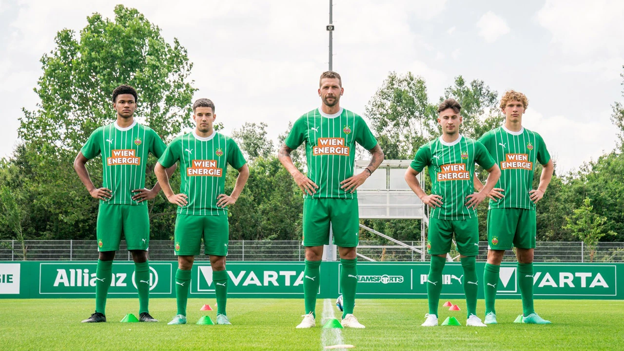 is the new Sportklub Rapid Wien (Vienna) Home shirt by Puma. The Austrian Bundesliga side’s 2023-24-season primary release is in green and this is decorated with thin white striping which is configured in a way that has been seen in other... This is the...