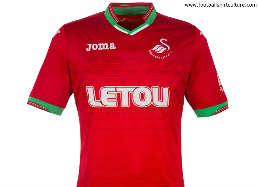 Swansea City launched their new 17/18 Away kit by Joma. The chilli red away jersey, featuring a subtle striped pattern, is completed with green mesh side panels and ribbed red, green and white cuffs and collar - the true colours of Wales....