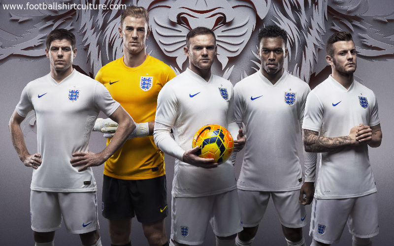 This is the new England Home football shirt and kit, by Nike, to be worn in the 2014 World Cup Finals in Brazil this coming summer. The shirt is in white with a pin-stripe effect and shiny satin strips on each shoulder, also featuring an original...