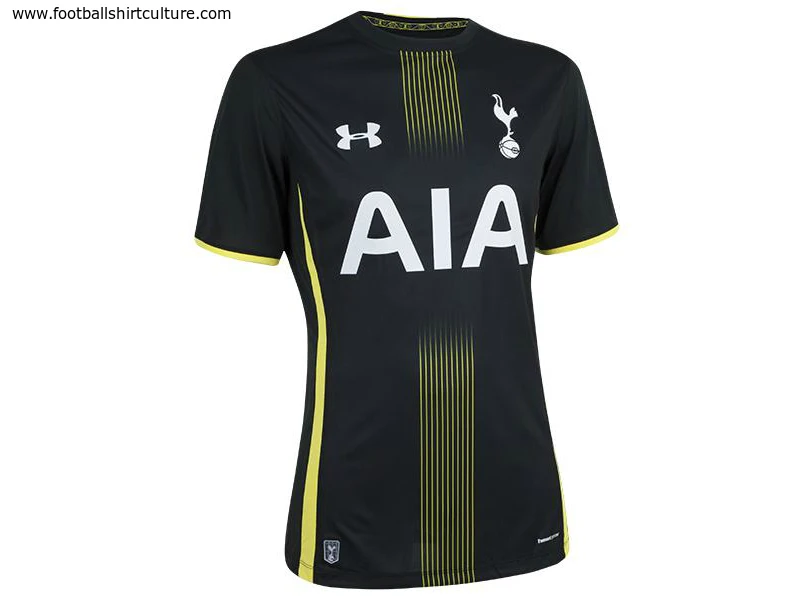 The image herein appears to show a Tottenham Hotspur change shirt for the 2014-15 season, by Under Armour. Most likely to be the Away shirt due to the contrast with the white of the Home version, the main body colour is black, with a shade of gold...