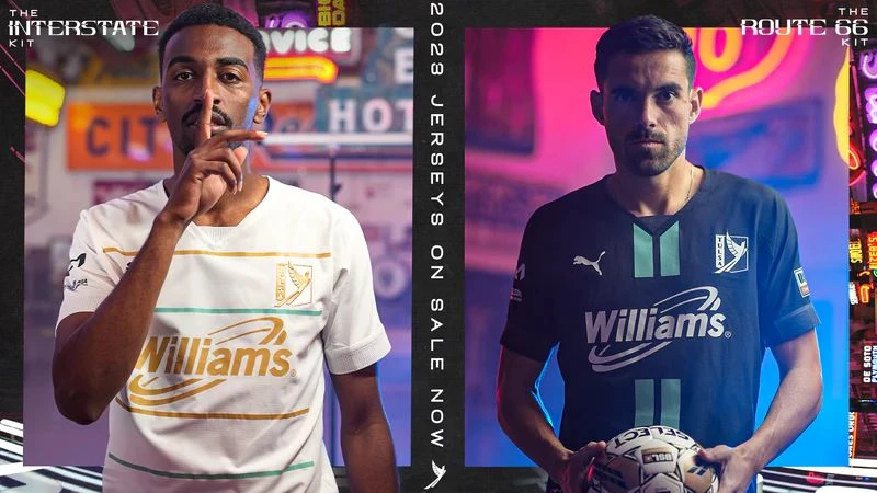 club’s Greenwood Avenue location. Dubbed “Interstate”, the white-based release bears a passing resemblance to the current Venezia away design, with its horizontal striping in gold and patina green. The crest and “Williams” sponsorship logo are in gold...