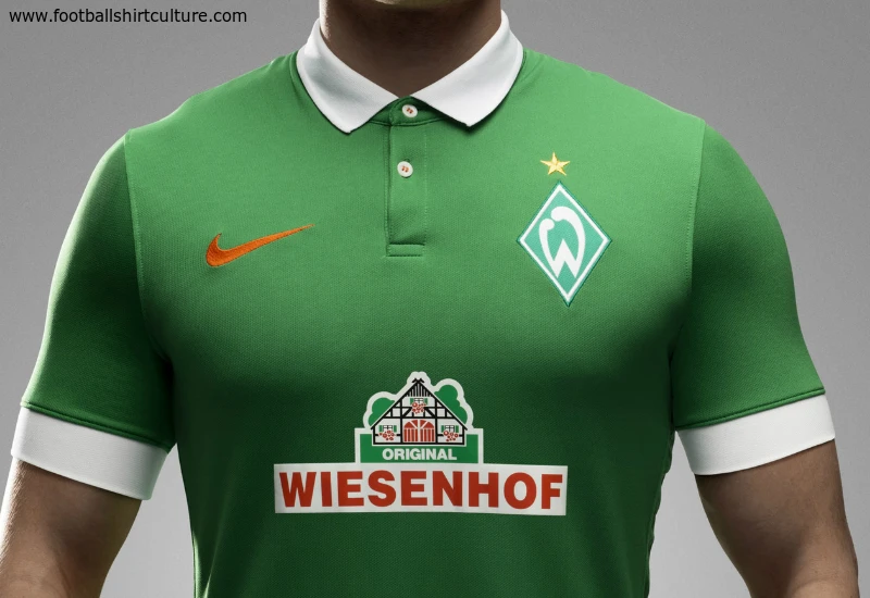 This is the new Werder Bremen 14/15 Home football shirt by Nike. The new home shirt has a green body adorned with a white ribbed collar and high cuffs. The polo neck collar has a long placket and features two buttons with an orange thread. Orange is...