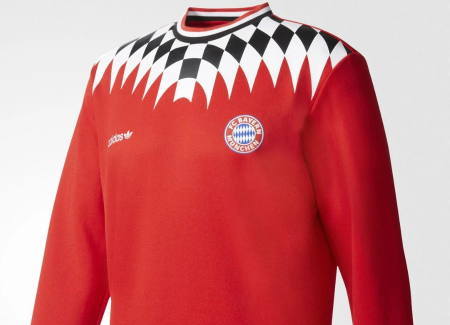 1994. FC Bayern München plays its 94th season. Inspired by the team's alternate jersey for that year, a dynamic diamond-shaped pattern follows the neckline and forms a "V" on this men's slim-fitting sweatshirt. The FC Bayern München crest and an...