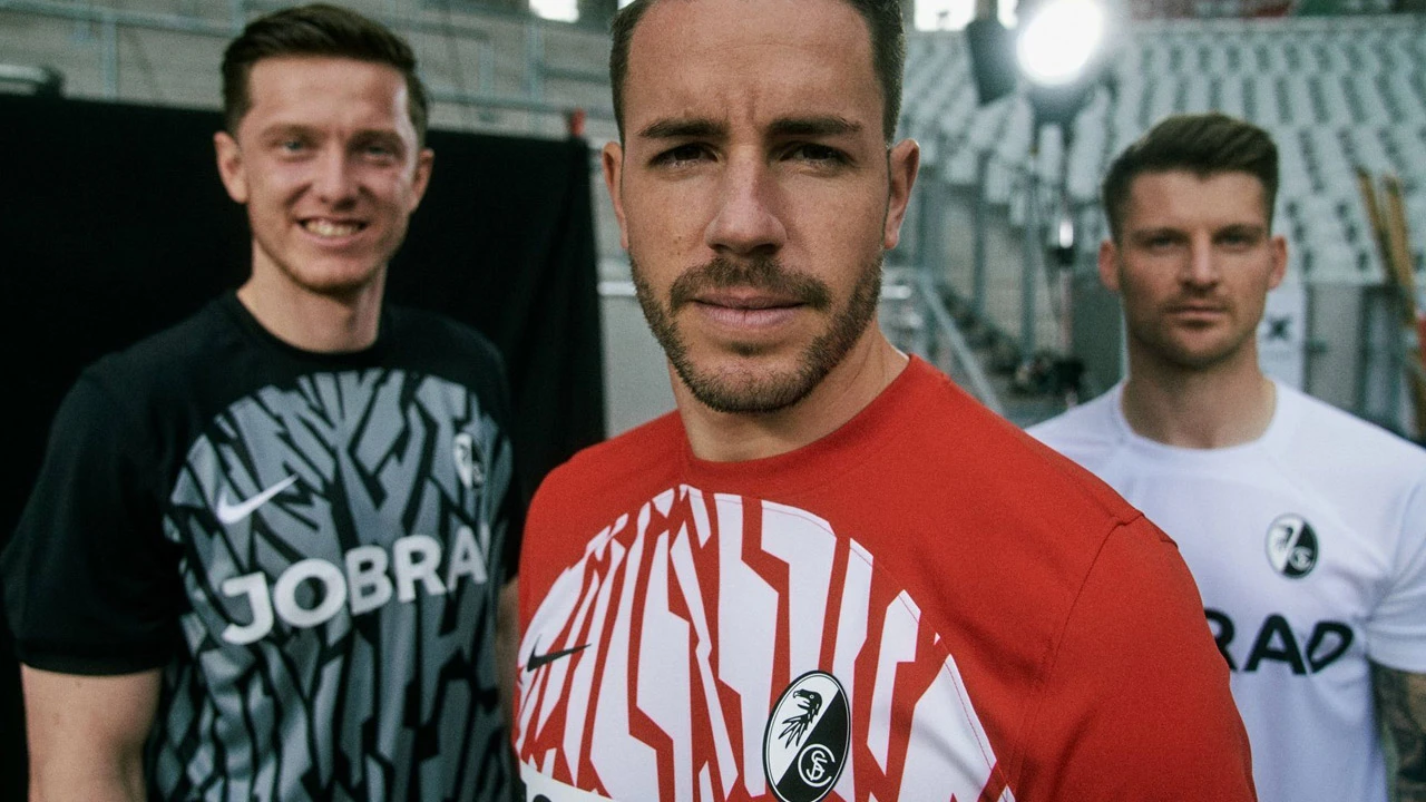 SC Freiburg, of Germany’s Bundesliga, have a striking trio of Nike shirts for 2023-24. The new Home is in red and white - including a bold trunk pattern and red raglan-sleeves effect - with black detailing, the Away is the same design but in black and...