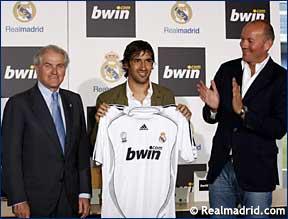 Bwin, the world leader in online gaming, will sponsor Real Madrid's football teams for the next three years according to the deal that was presented in the Presidential Balcony of the Santiago Bernabéu Stadium. The event was presided over by Real Madrid President, Ramón Calderón and Co-CEO of Bwin, Manfred Bodner. Raúl González, captain of the First Team, unveiled the new shirt that will carry the name of the new sponsor.