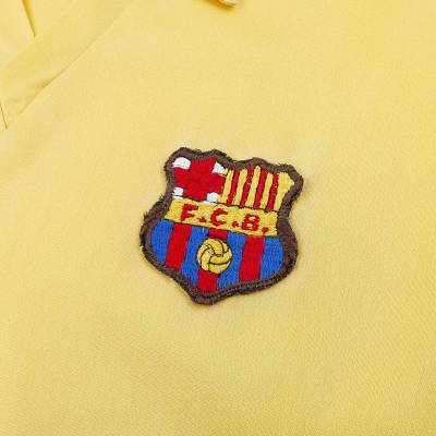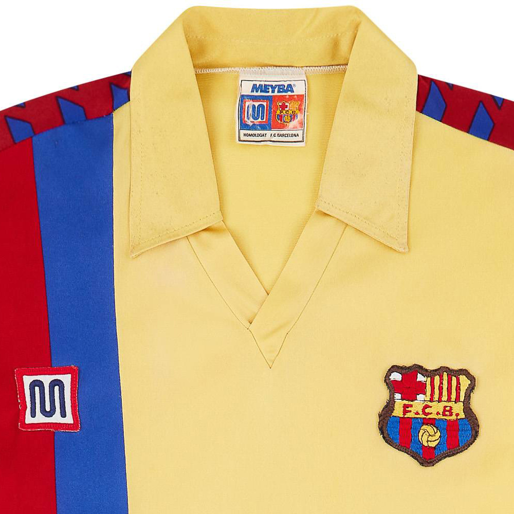 Meyba’s yellow away strip of 1982 to 1985 stands among the most charismatic shirts in Barcelona history. The shiny polyester body was cut in the Catalan maker’s roomy “track” silhouette and framed by a fold-over collar with a neat V insert.