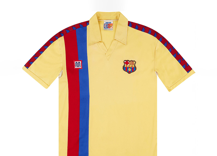 Meyba’s yellow away strip of 1982 to 1985 stands among the most charismatic shirts in Barcelona history. The shiny polyester body was cut in the Catalan maker’s roomy “track” silhouette and framed by a fold-over collar with a neat V insert.