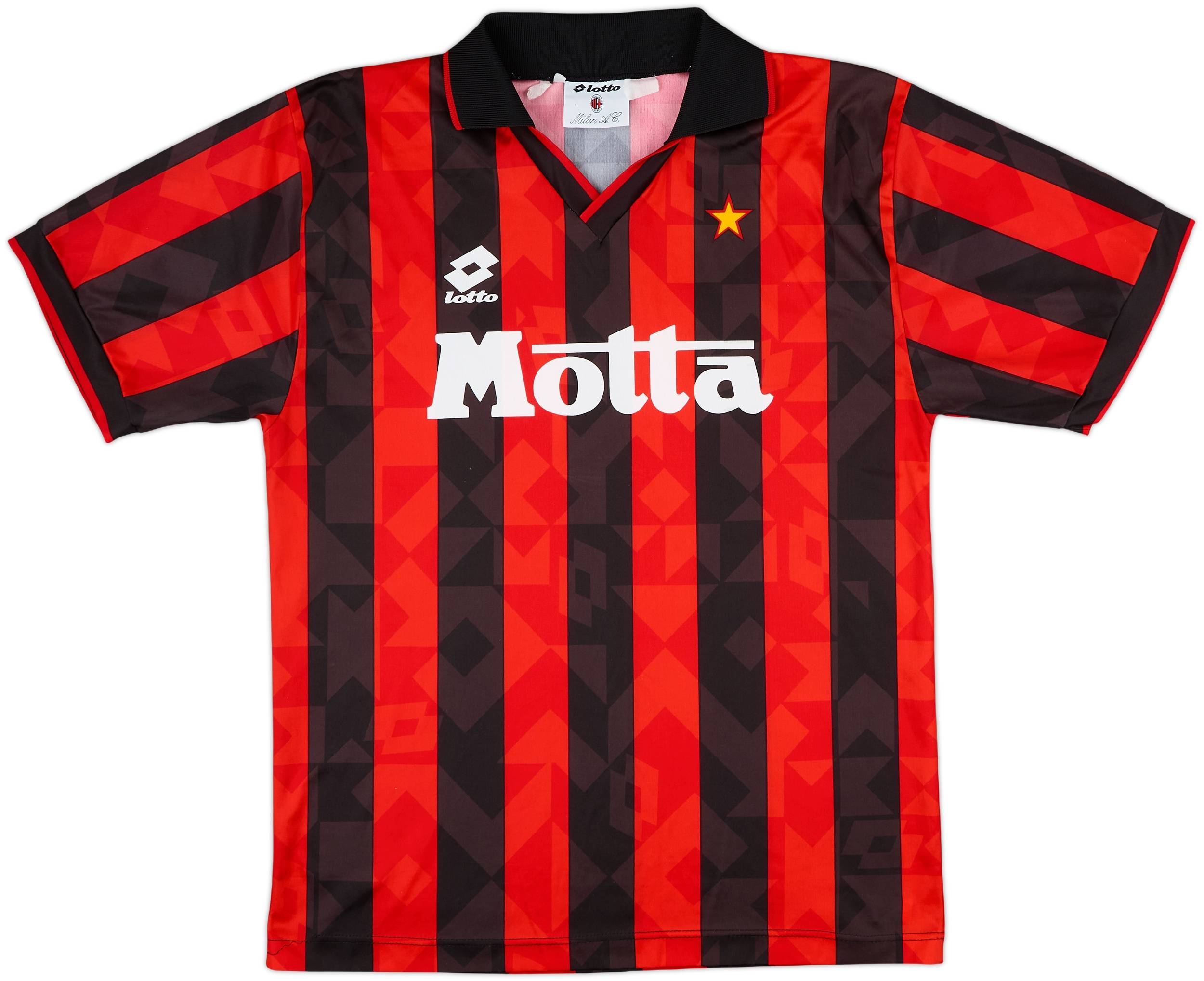 AC Milan’s 1993–94 Home shirt, produced by Lotto and worn during one of the club’s most successful seasons, is closely tied to Fabio Capello’s treble-winning campaign. The side finished top of Serie A, lifted the UEFA Champions League with a 4–0 victory over Barcelona in the final, and also took the Supercoppa Italiana that year.