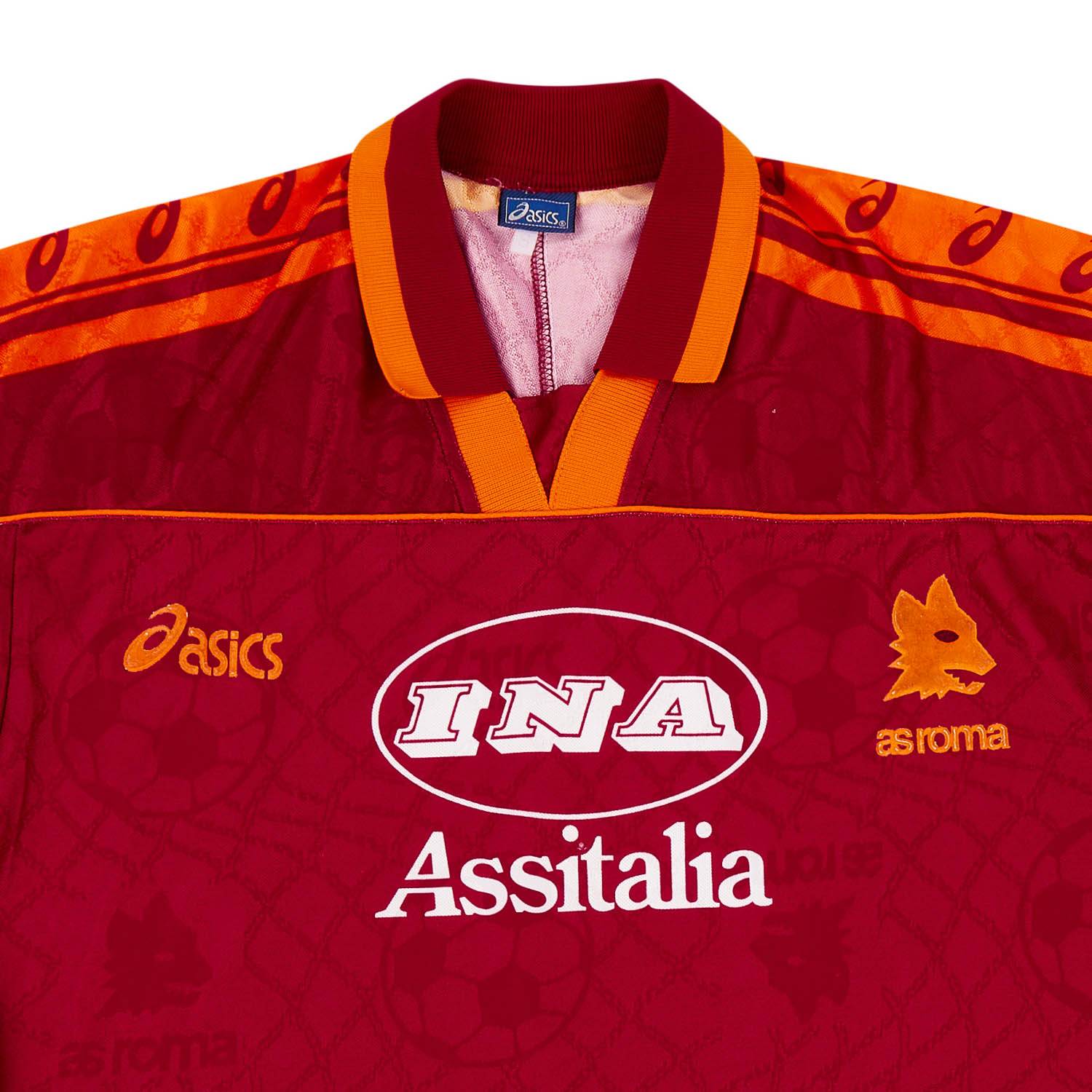 This AS Roma home shirt was worn during the 1995/96 Serie A season, when the team finished fifth under new manager Carlos Bianchi.