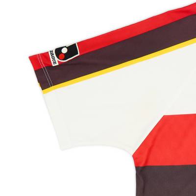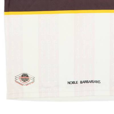 The wordmark branding for the British supplier combined with the white, red, black and yellow (secondary) colours of their client make for a striking look and the “NOBLE BARBARIANS” hem legend is a neat feature.