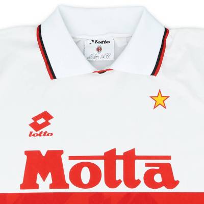 Lotto’s 1993-94 AC Milan away shirt is a master-class in less-is-more Italian style. The crisp white base is punctuated only by a broad red-and-black chest band, the red Motta word-mark, Lotto logo and a single golden stella above the heart, a reminder of the club’s ten previous Scudetti.