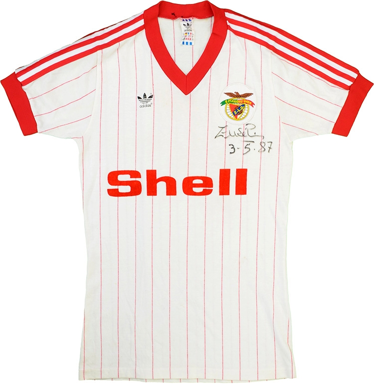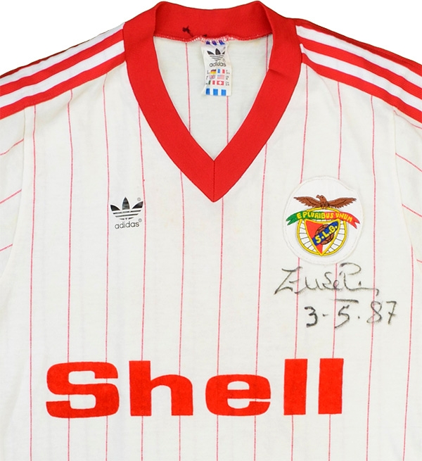 The side wore this superb pinstripe Adidas design with the classic Shell sponsor that was present on the club's shirts until '87. The shirt is signed by all-time great Eusebio and was given to a player the club were hoping to sign as a gift in the summer of 1987.
