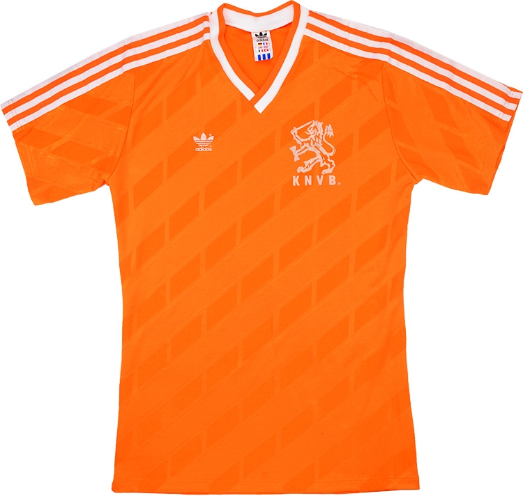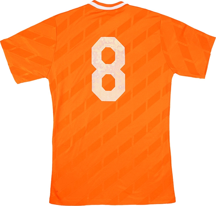This design was worn by Mühren in the three friendly games in 1988 prior to the tournament itself. The Oranje drew 2-2 at Wembley, were shocked by Bulgaria in Rotterdam and beat Romania in Amsterdam to complete a mixed build-up to the Finals. A special kit was released for Euro 88 and worn in every game there with this design then returning for the 1990 World Cup qualifying campaign. The Euro 88 triumph capped a career of remarkable success for Mühren in which at club level he became one of only six players to win all of the international club competitions, with all but the UEFA Cup won with Ajax, that trophy he picked up while at Ipswich Town.