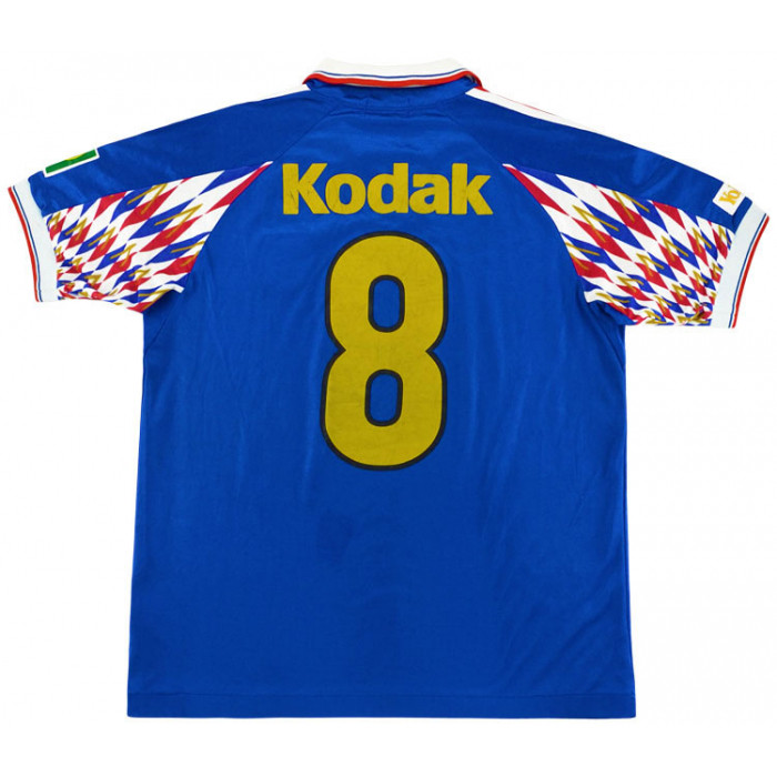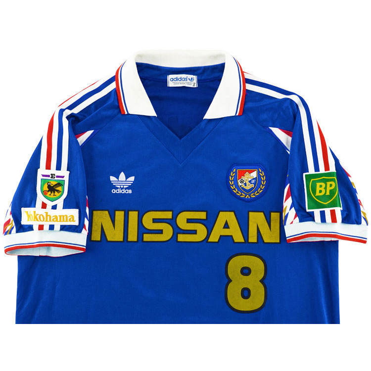 Yokohama F. Marinos 1993 player shirt by Adidas believed to have been issued to or match worn by a #8 when the Marinos finished 4th in the J. League under Hidehiko Shimizu. This shirt was also worn in the 1992 Emperor's Cup Final against Verdy Kawasaki where the match went into extra-time and Marinos forward Jinno scored the winning goal.