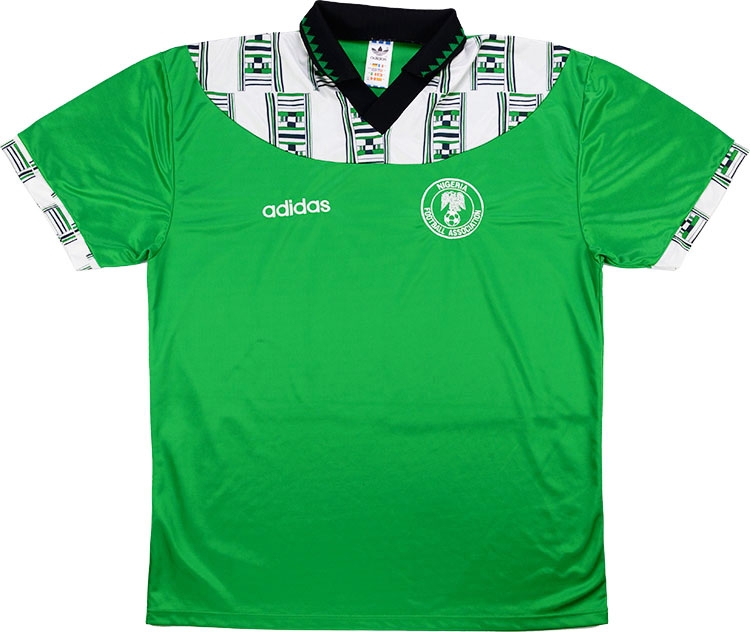 Nigeria 1994-95 home shirt by Adidas worn at the 1994 World Cup in USA where the side beat Bulgaria and Greece to qualify for the Second Round. They were narrowly edged out by Italy after leading the game until the 88th minute when Roberto Baggio levelled the scores and then won the tie in extra-time.