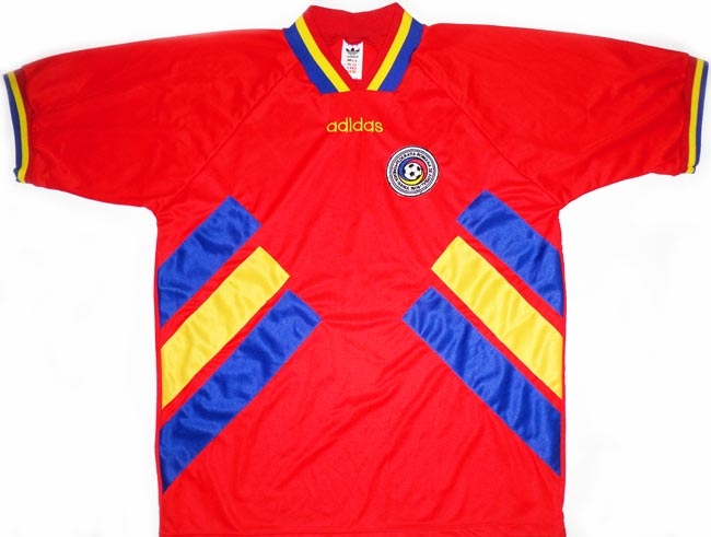 Romania 1994-96 away shirt by Adidas as worn at World Cup 94 when the side enjoyed a great run to the Quarter Finals before going out on penalties to Sweden. This design was worn in that match which had to be decided from the spot following a dramatic 2-2 draw.